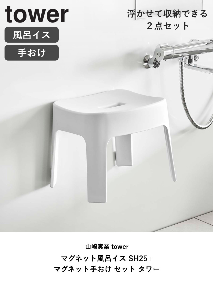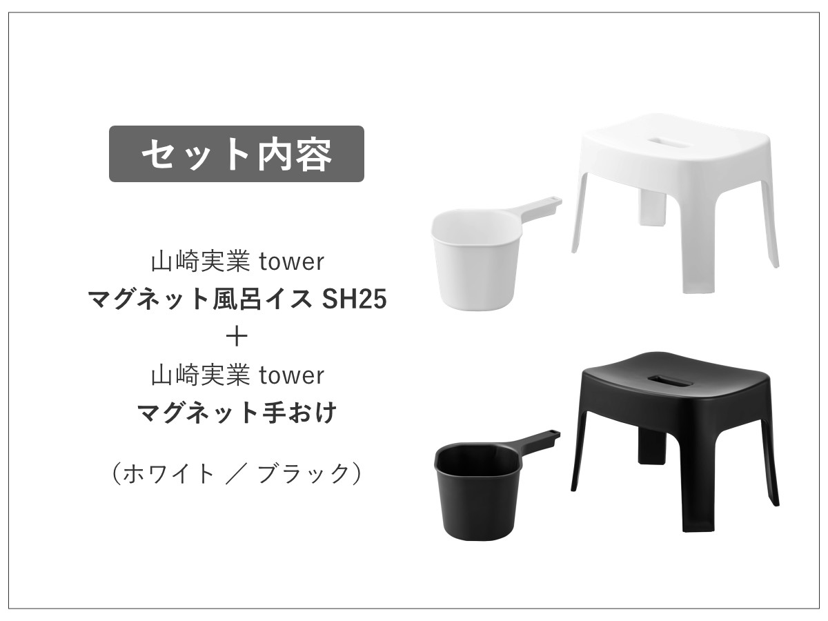 山崎実業 tower マグネット風呂イス SH25+マグネット手おけ セット タワー ( 4903208069250 バスチェア 座面25cm 手桶 洗面器 磁石 浮かせる ホワイト ブラック ) 【ブラック】