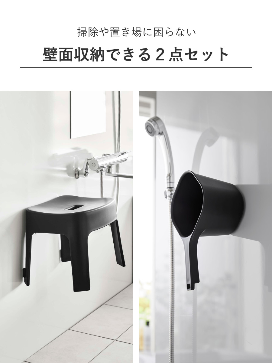 浴室の壁面にマグネットでピタっとくっつく風呂イスと手おけの2点セットです。浴室の床に直接置かないので、ヌメリや水垢が付くのを防ぎ、清潔に収納できてお掃除もラクラクです。シンプルなデザインで、お風呂のどこに置いても馴染みます。