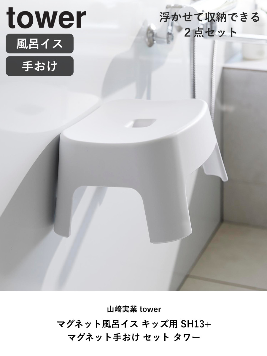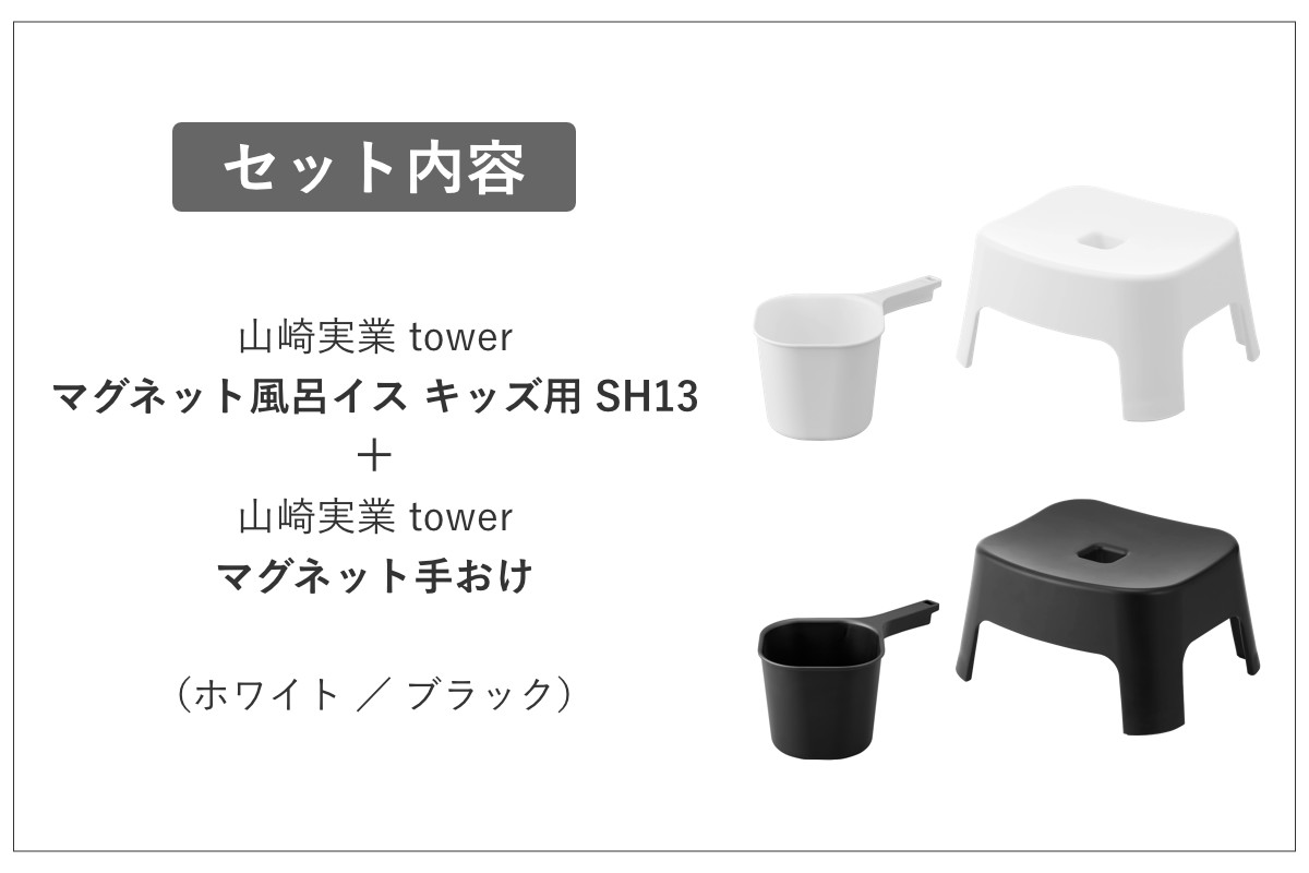 山崎実業 tower マグネット風呂イス キッズ用 SH13+マグネット手おけ セット タワー ( 4903208018524 バスチェア 洗面器 子ども用 風呂おけ 磁石 座面高13cm ホワイト ブラック ) 【ブラック】