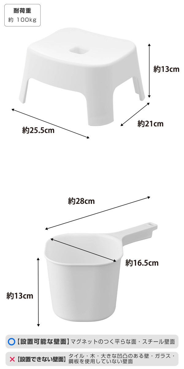 | 材質 | 【風呂イス】 本体:ポリプロピレン、エラストマー、ABS樹脂、ネオジムマグネット 【手おけ】 本体:ポリプロピレン、マグネット |