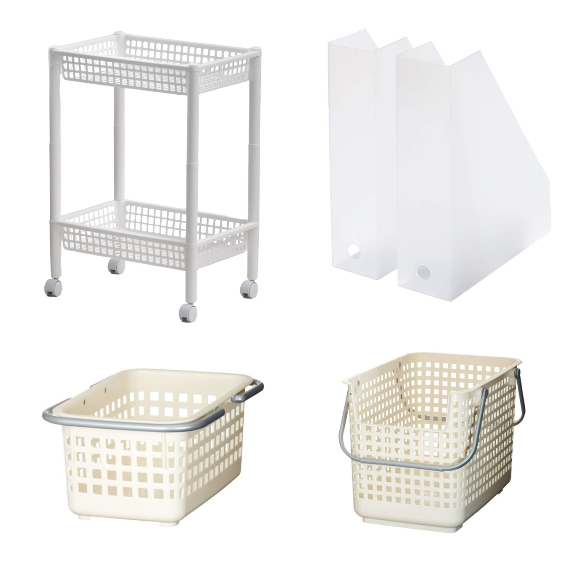 | 内容量 | 4点セット (ランドリーワゴン、ファイルケース(スリム×1、ワイド×1)、バスケット(小)、バスケット(大)) 付属品:インデックスシール |