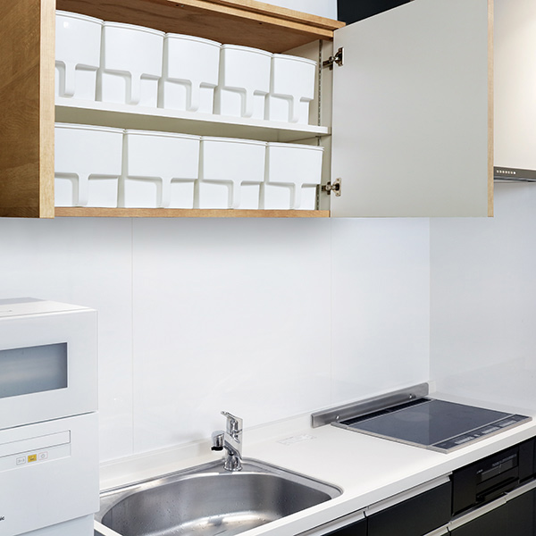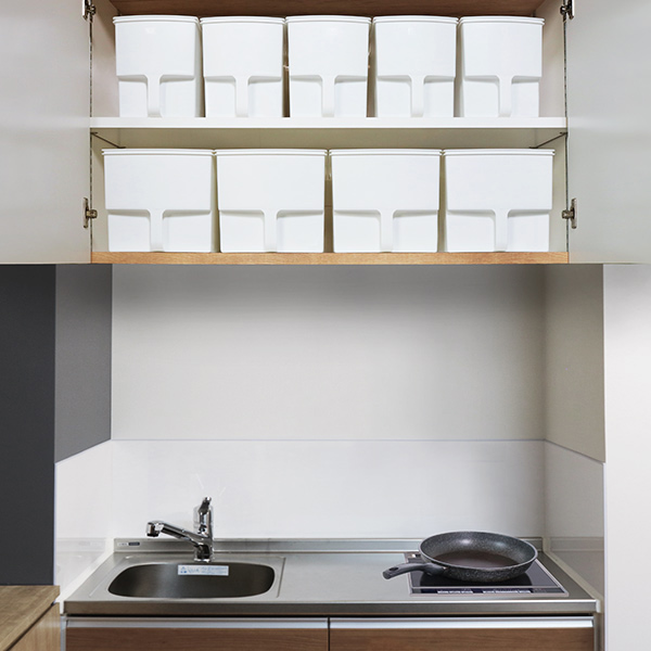 食品や消耗品の収納に便利な取っ手付き収納ボックスです。一般的な吊戸棚は奥行き約36cmのものが多いため、収納して扉も閉められるように奥行き約33.4cmに設計されています。扉のない吊戸棚でも、生活感を隠してすっきりと整理収納できます。