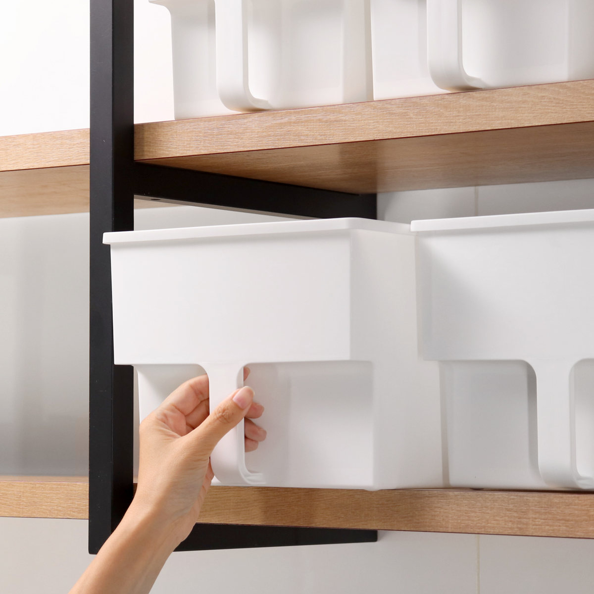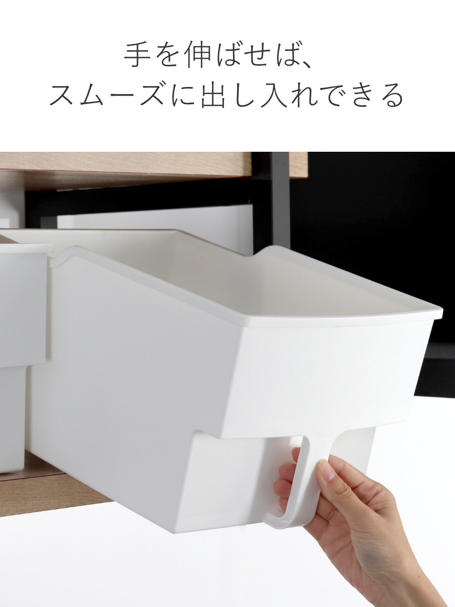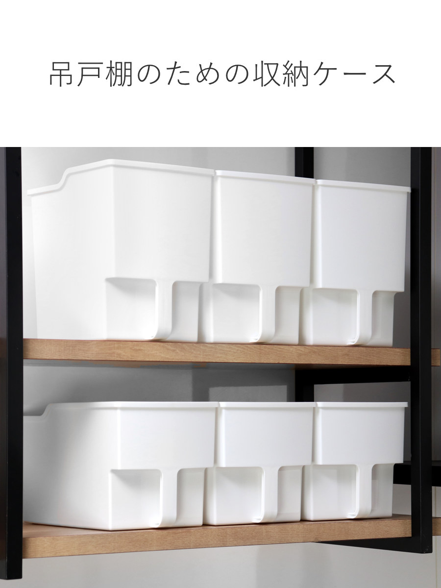食品や消耗品の収納に便利な取っ手付き収納ボックスです。一般的な吊戸棚は奥行き約36cmのものが多いため、収納して扉も閉められるように奥行き約33.4cmに設計されています。扉のない吊戸棚でも、生活感を隠してすっきりと整理収納できます。