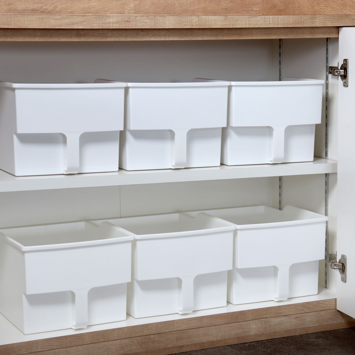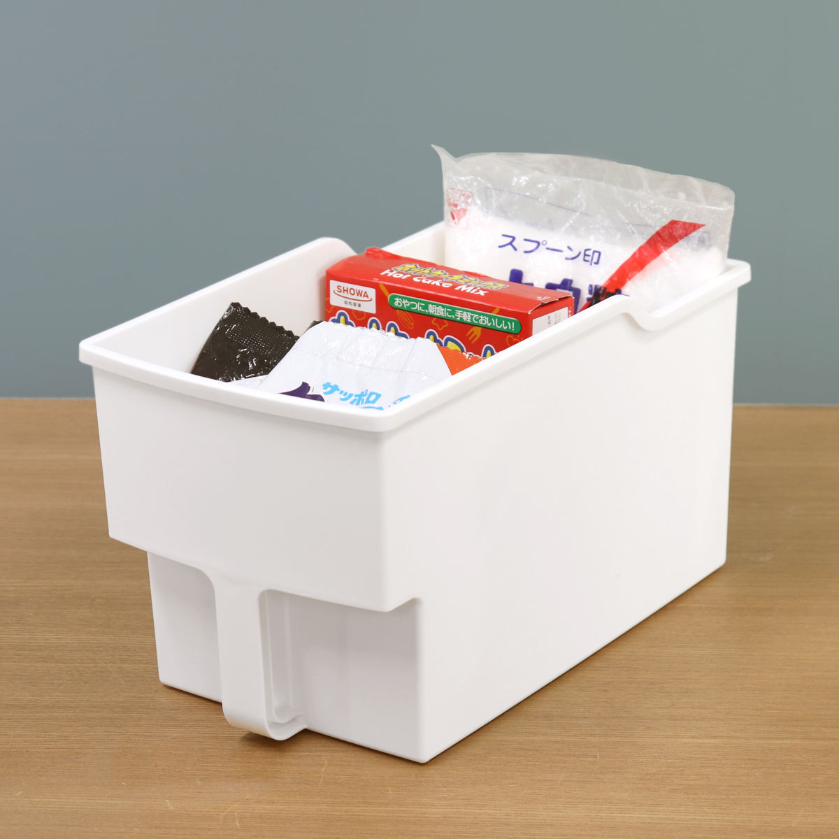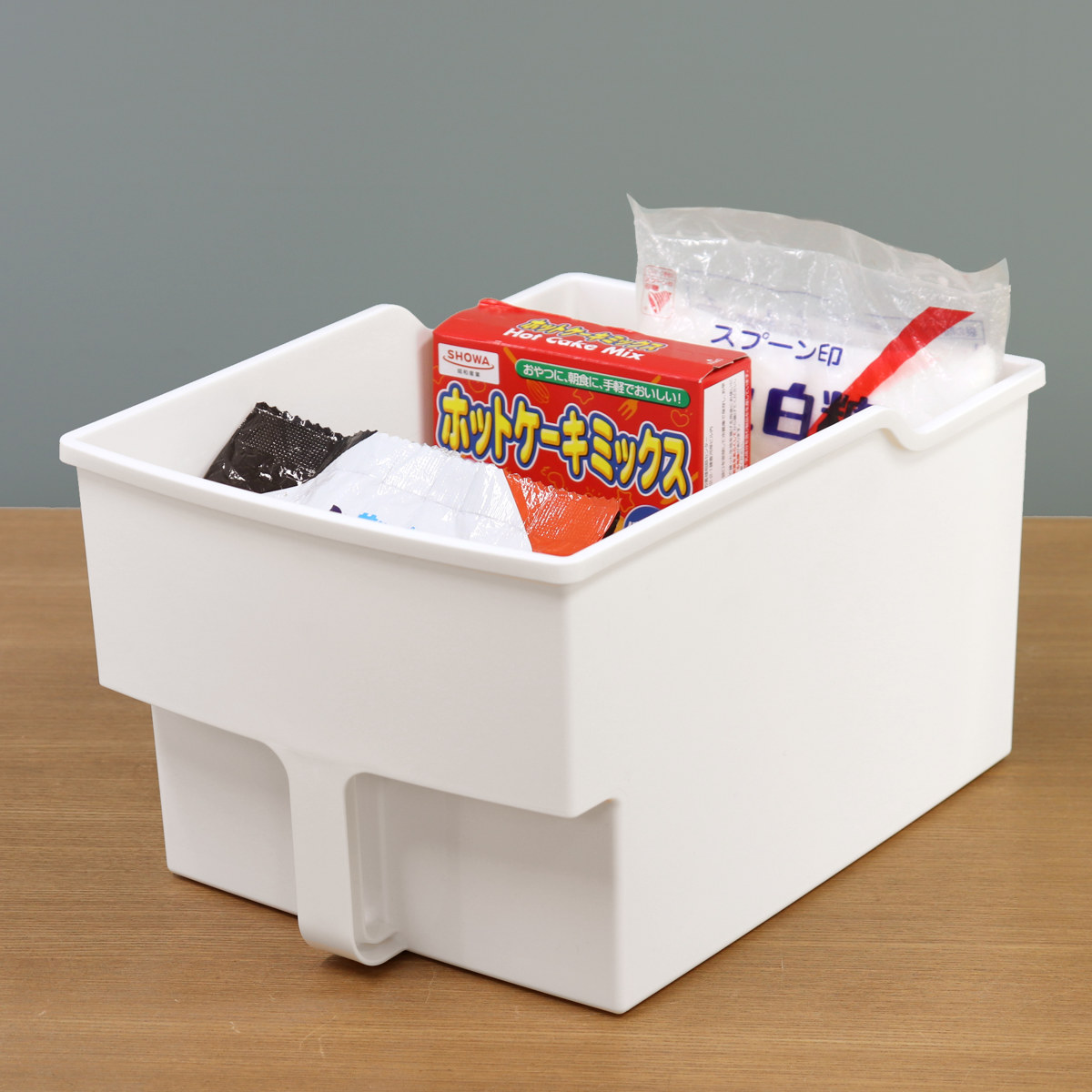 食品や消耗品の収納に便利な取っ手付き収納ボックスです。一般的な吊戸棚は奥行き約36cmのものが多いため、収納して扉も閉められるように奥行き約33.4cmに設計されています。扉のない吊戸棚でも、生活感を隠してすっきりと整理収納できます。