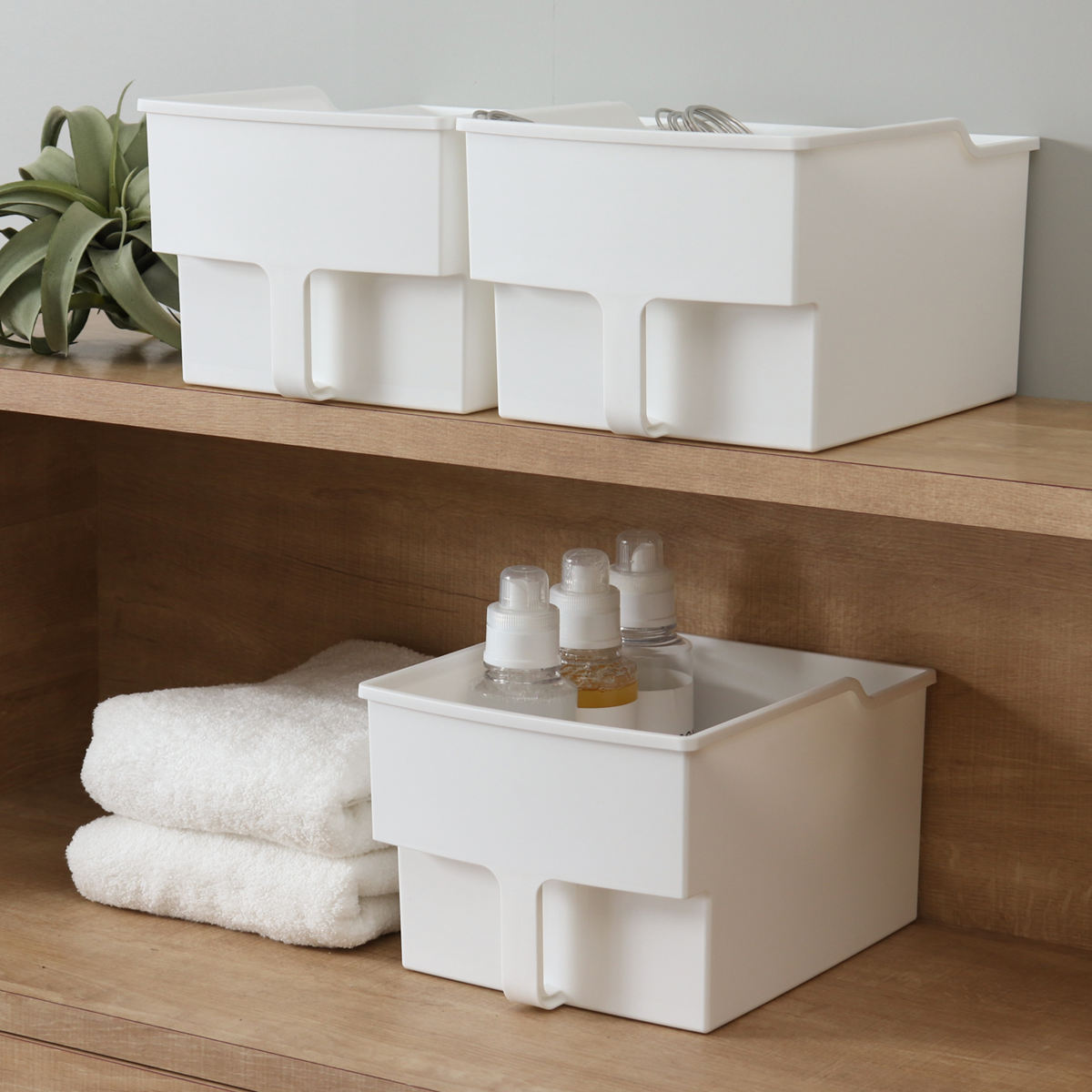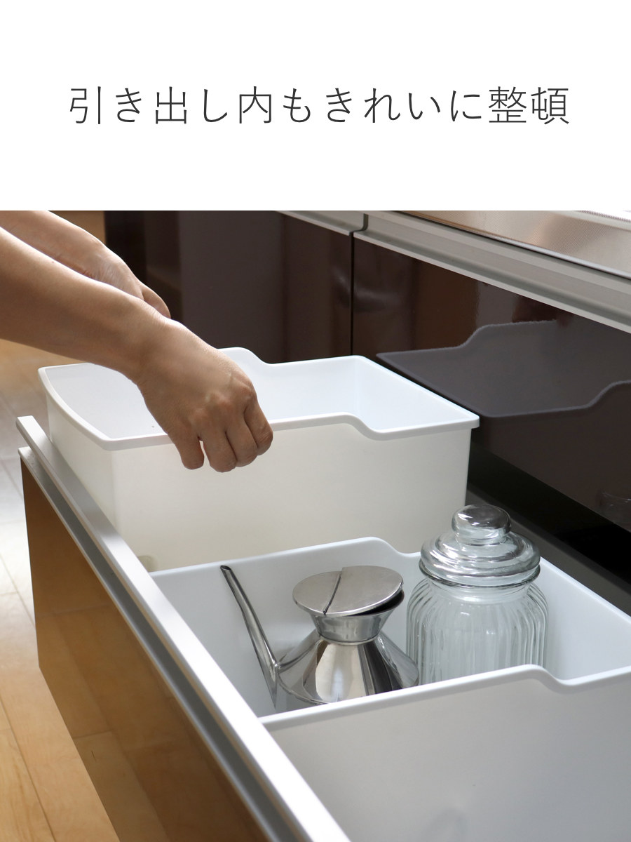 浅型タイプは高さのない吊戸棚や食器棚にも置くことができます。深すぎないので中の物が埋もれず、出し入れもスムーズ。小物類の収納にぴったりです。