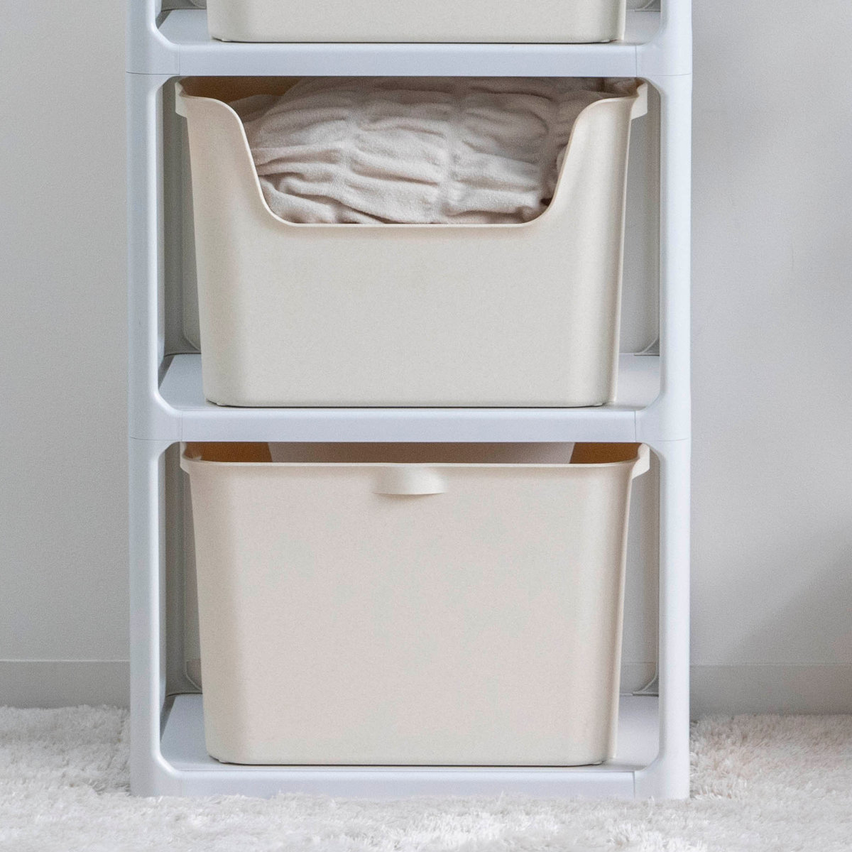 収納ボックスは、衣類やバスタオルなどをたっぷり収納できるLサイズ。棚から出したりしなくても、正面の開口部からポイっと入れられるため、この特徴を生かしてランドリーバスケットとしてもお使いいただけます。