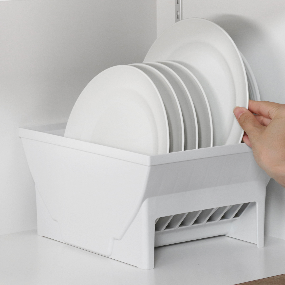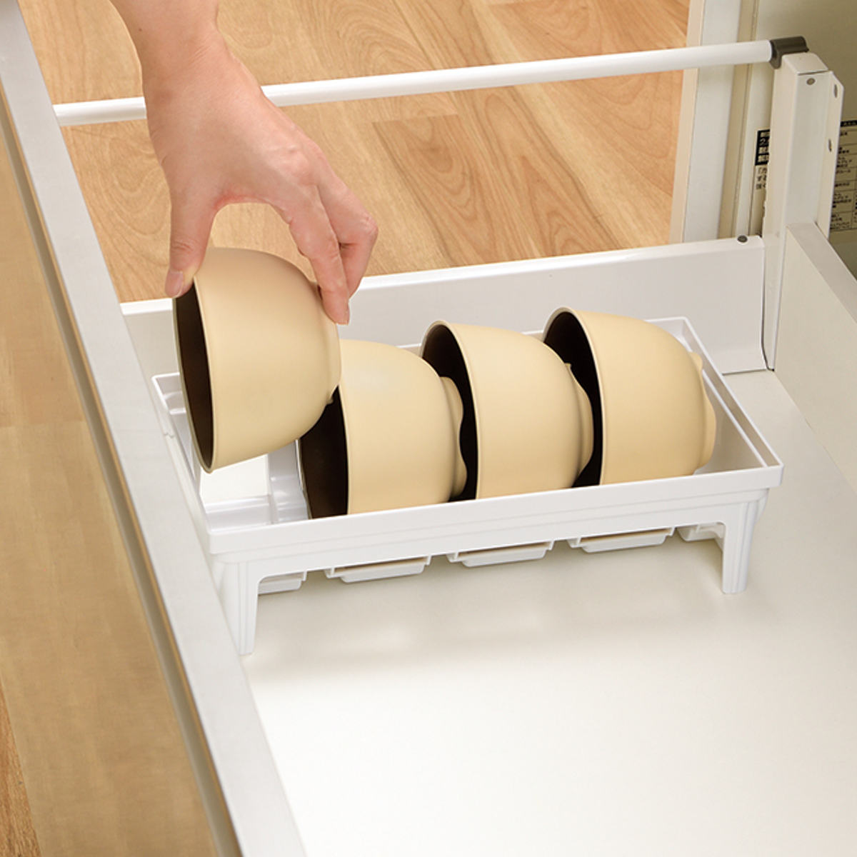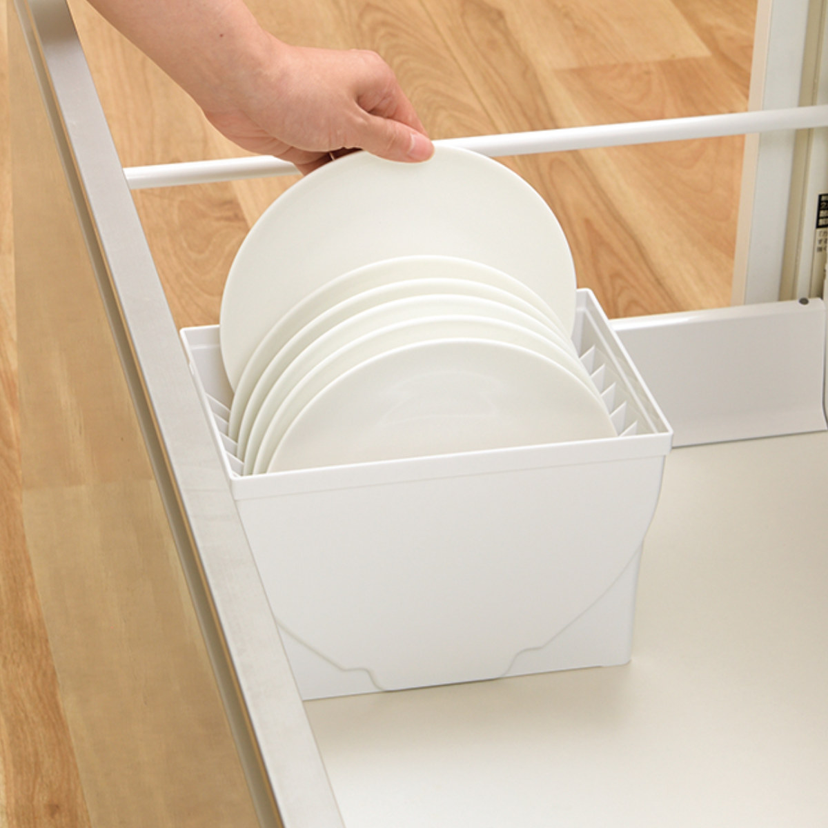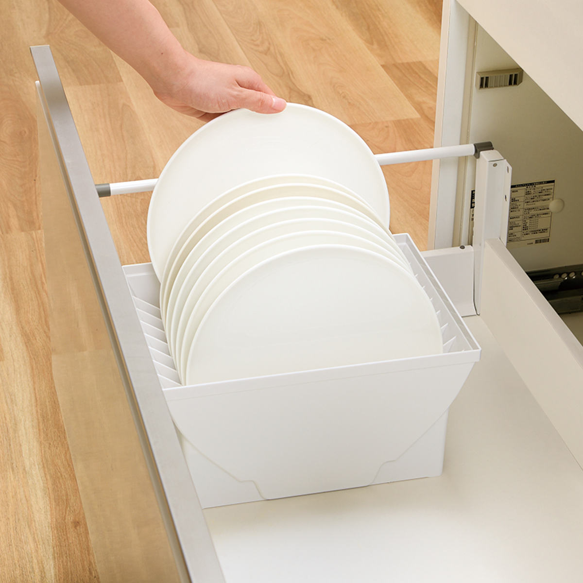 引き出しの中に食器の定位置を作り、美しく収納できます。どこに何があるか引き出しを開けたときに分かりやすく、出した食器をどこに戻すかも一目瞭然です。また、シンクやコンロ下の低い位置に立てて収納することで、お皿が崩れたり落下してしまう事を防ぎ、地震対策になります。