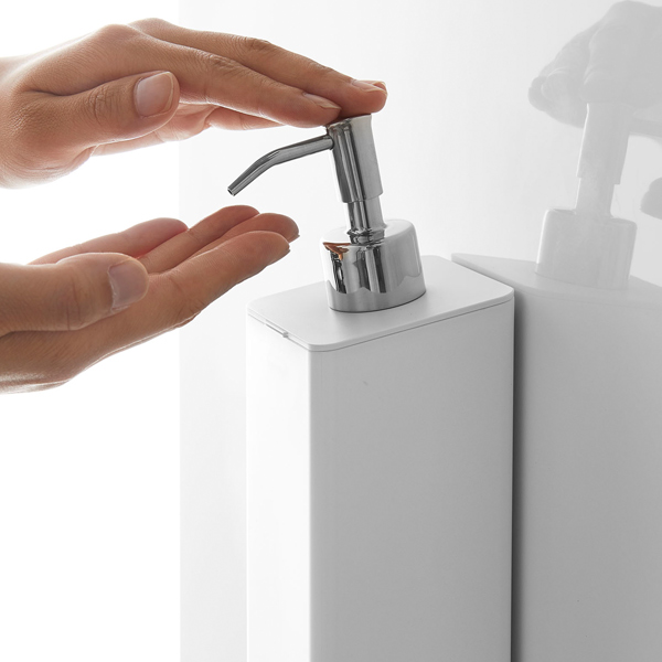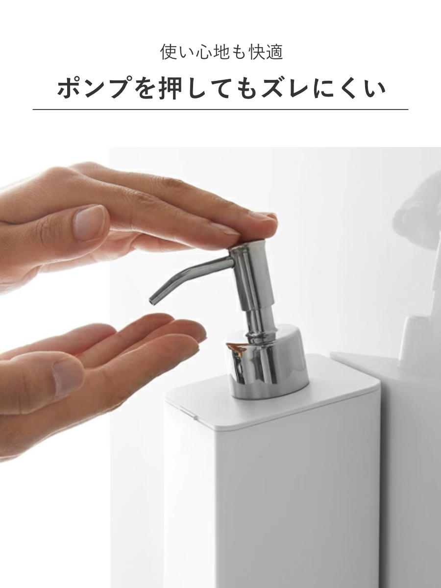 浴室の壁面に設置したまま、ポンプを押して液体を出すことができます。ポンプ部が斜めになっているため、押す力が分散されてズレにくく、快適にお使いいただけます。
