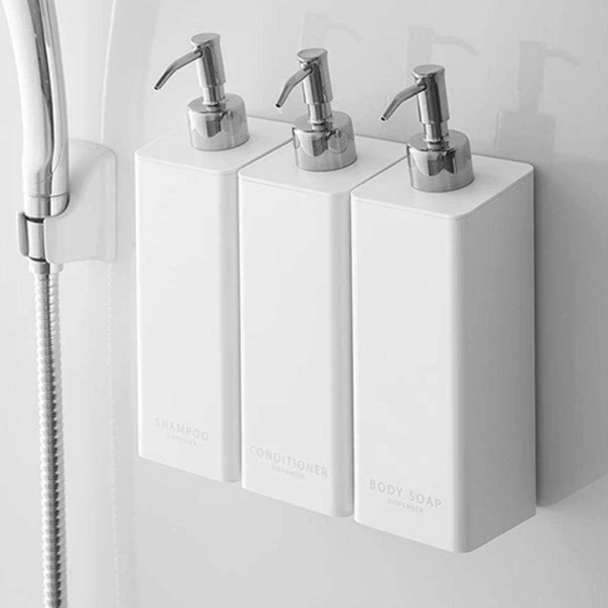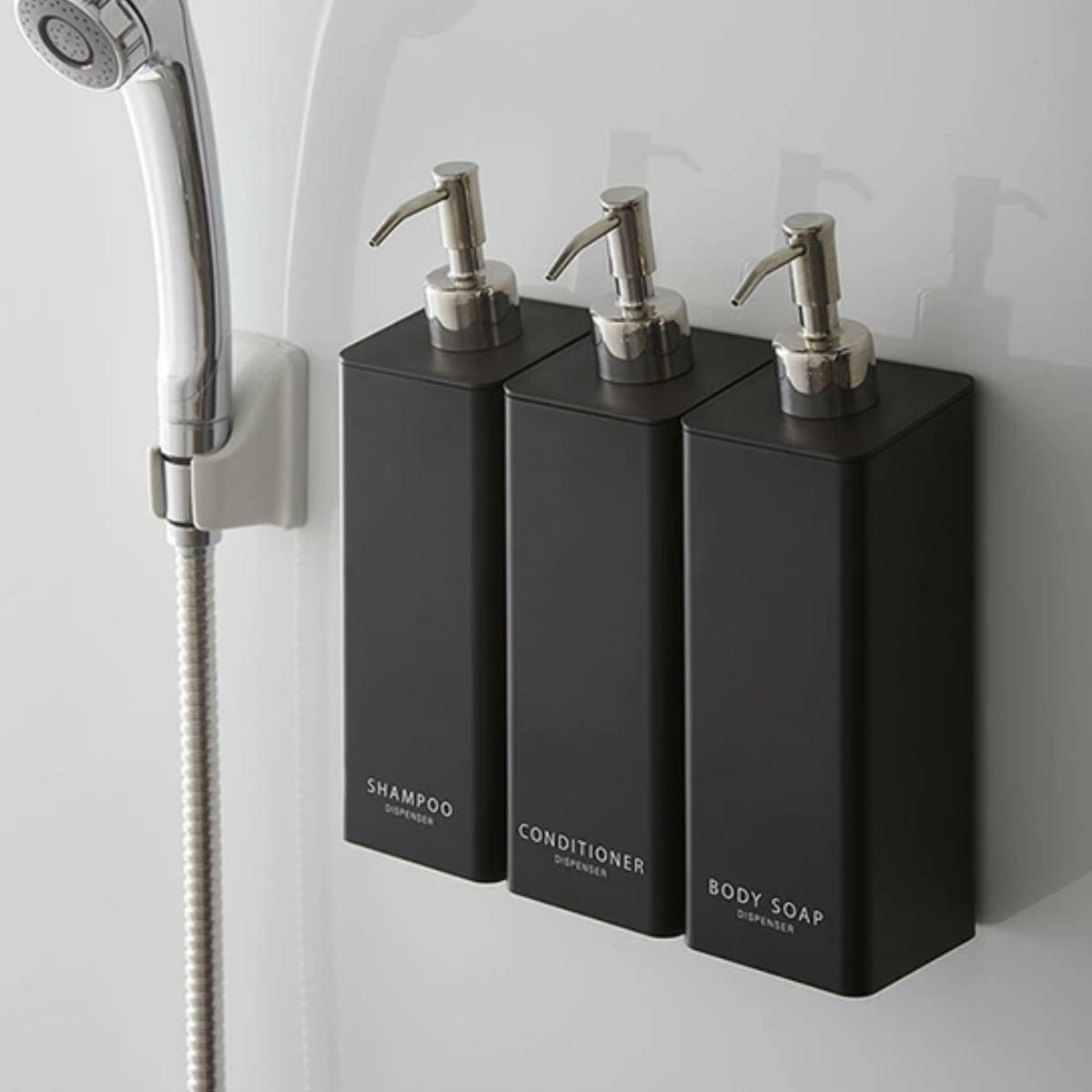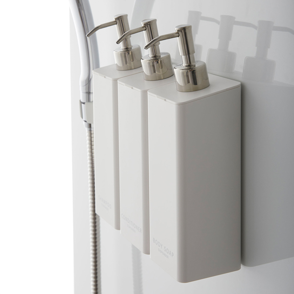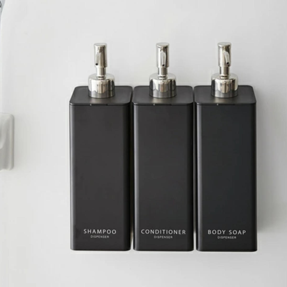 浴室の壁面に強力マグネットでピタッと取り付けられるディスペンサー。「シャンプー」「コンディショナー」「ボディソープ」の3本セットで、好きな場所に簡単設置。浮かせて使えるから底がぬめらず、清潔に保てます。ラバータイプのマグネットで、壁を傷つけにくく錆びにくいのもポイントです。