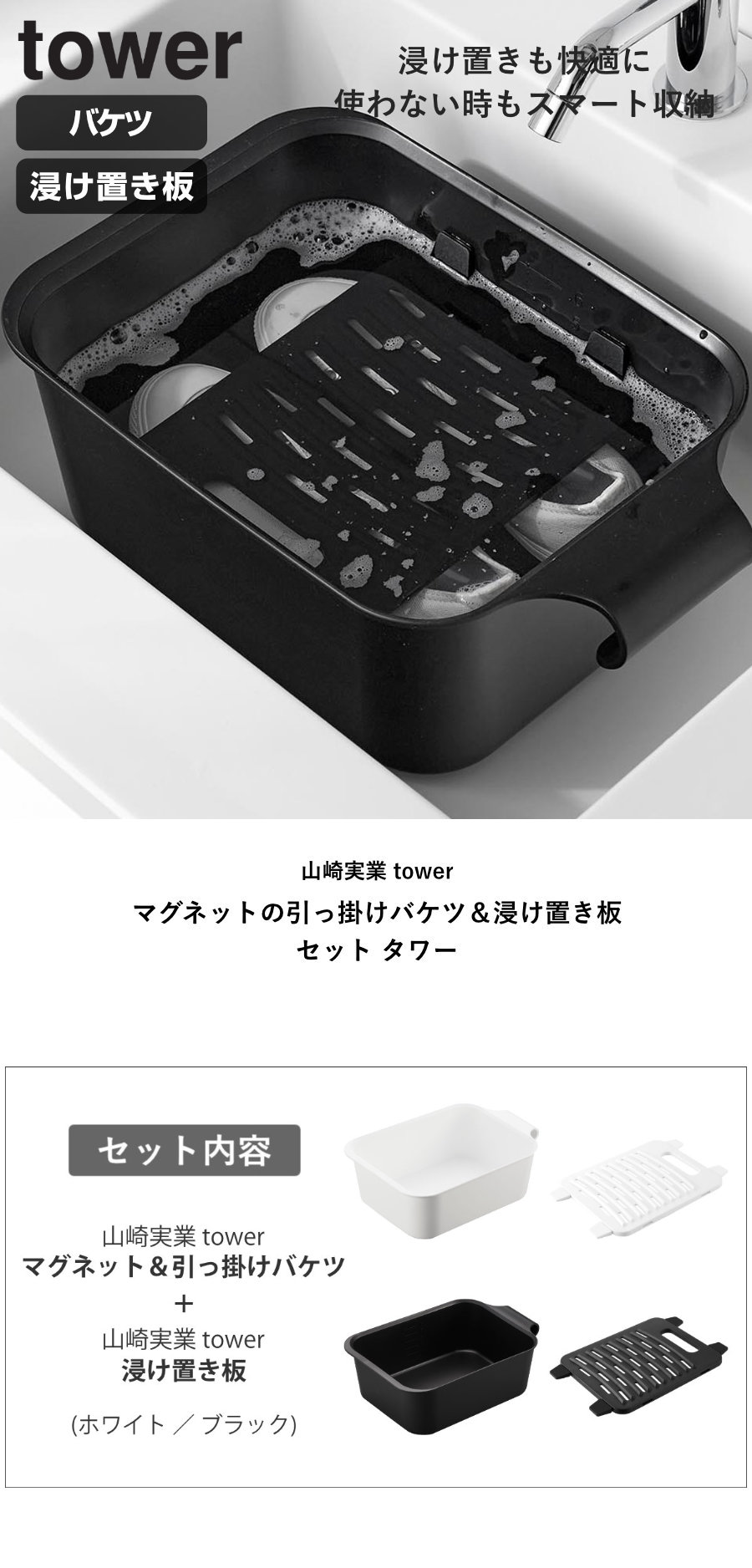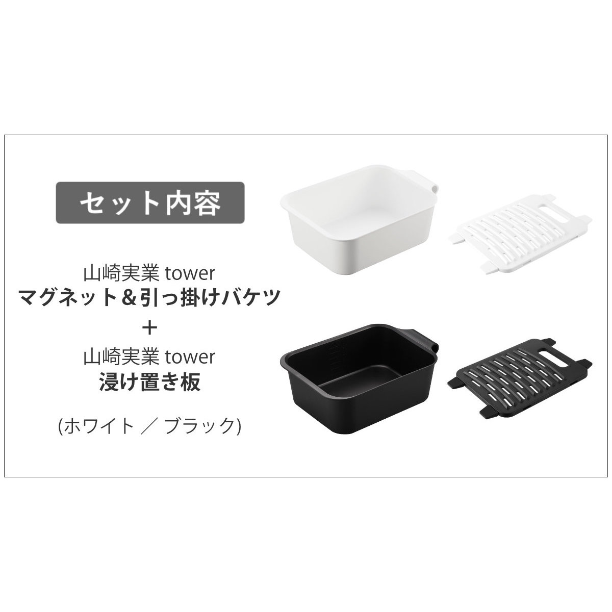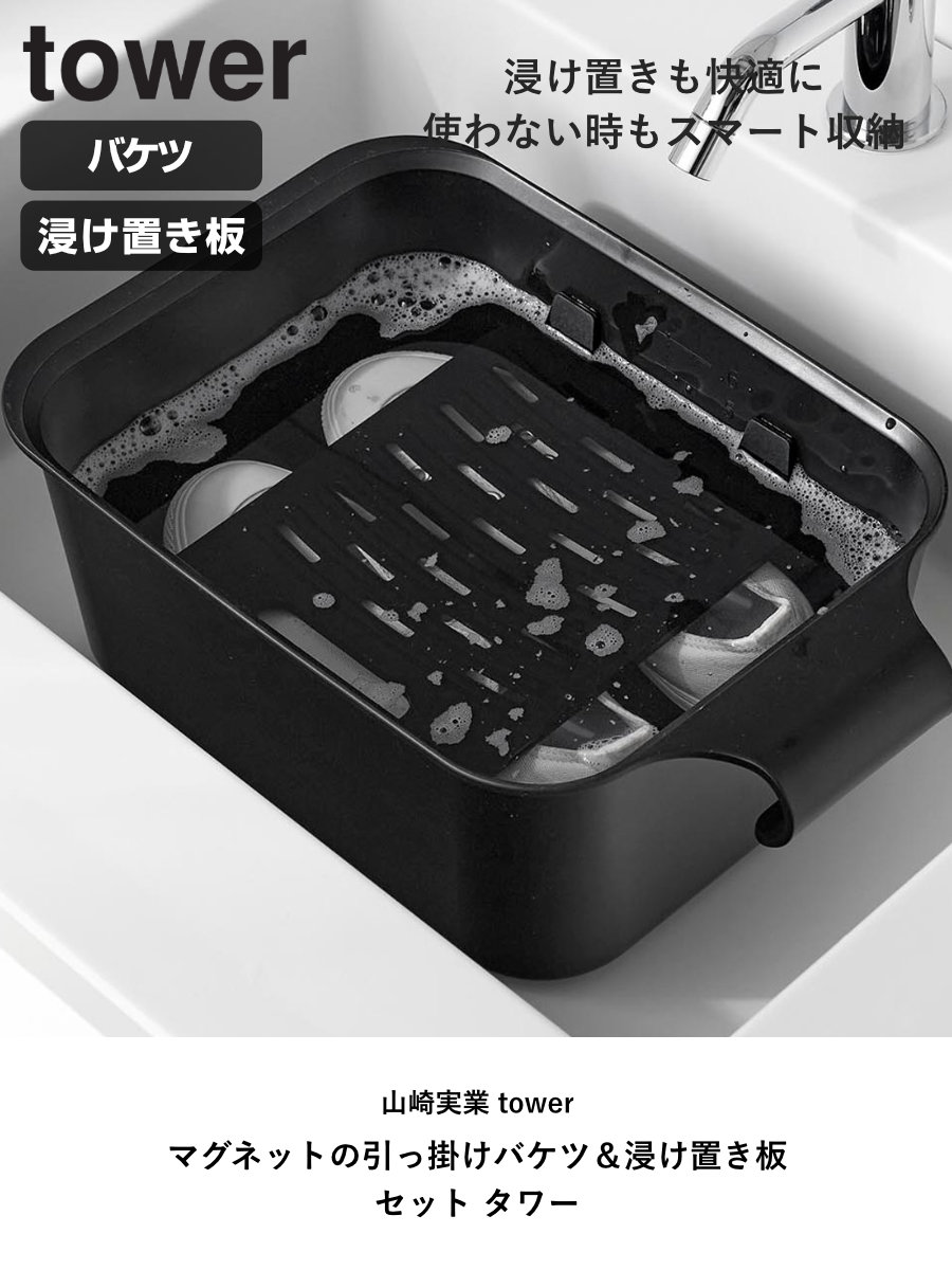 山崎実業 tower マグネットの引っ掛けバケツ&浸け置き板 セット タワー ( 4903208018326 タワーシリーズ バケツ 四角 マグネット付きバケツ マグネット 洗濯板 浸け置き板 浸け置き ウォッシュボード ) 【ホワイト】