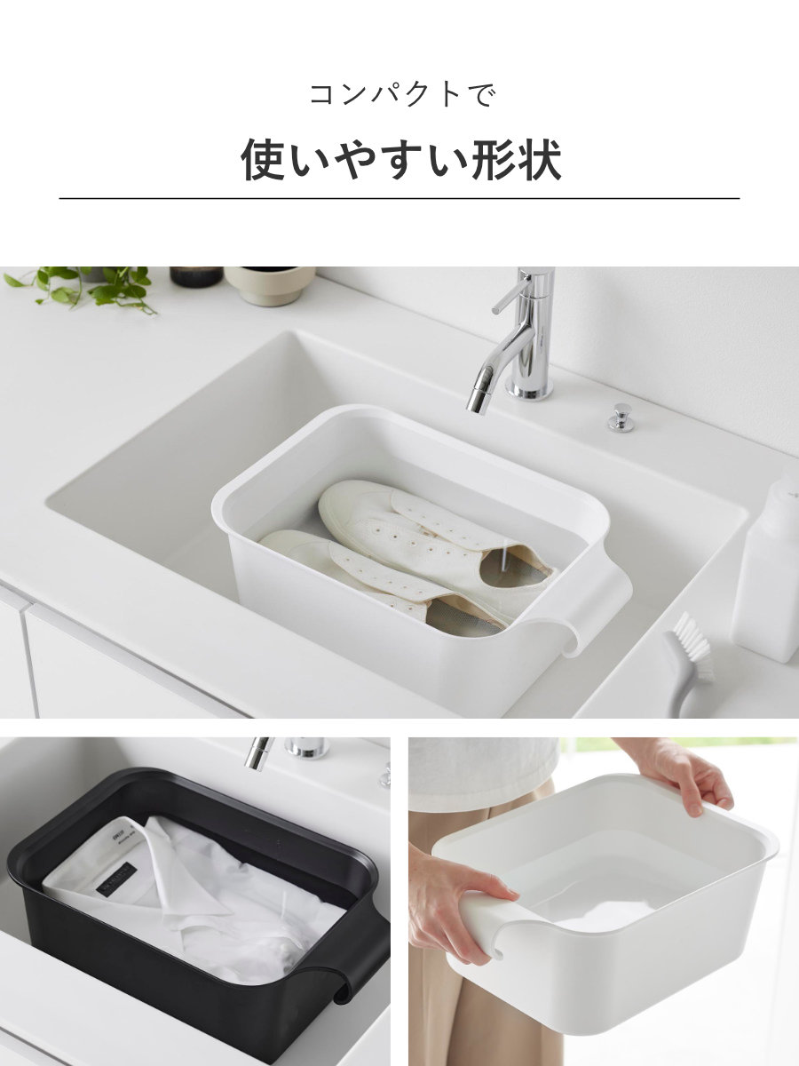 洗面台でも水が入れやすい四角い形状のバケツです。大人の衣類やシューズも入る容量のサイズ感で、しっかり持ちやすいので、水を入れたままでも安心して持ち運べます。