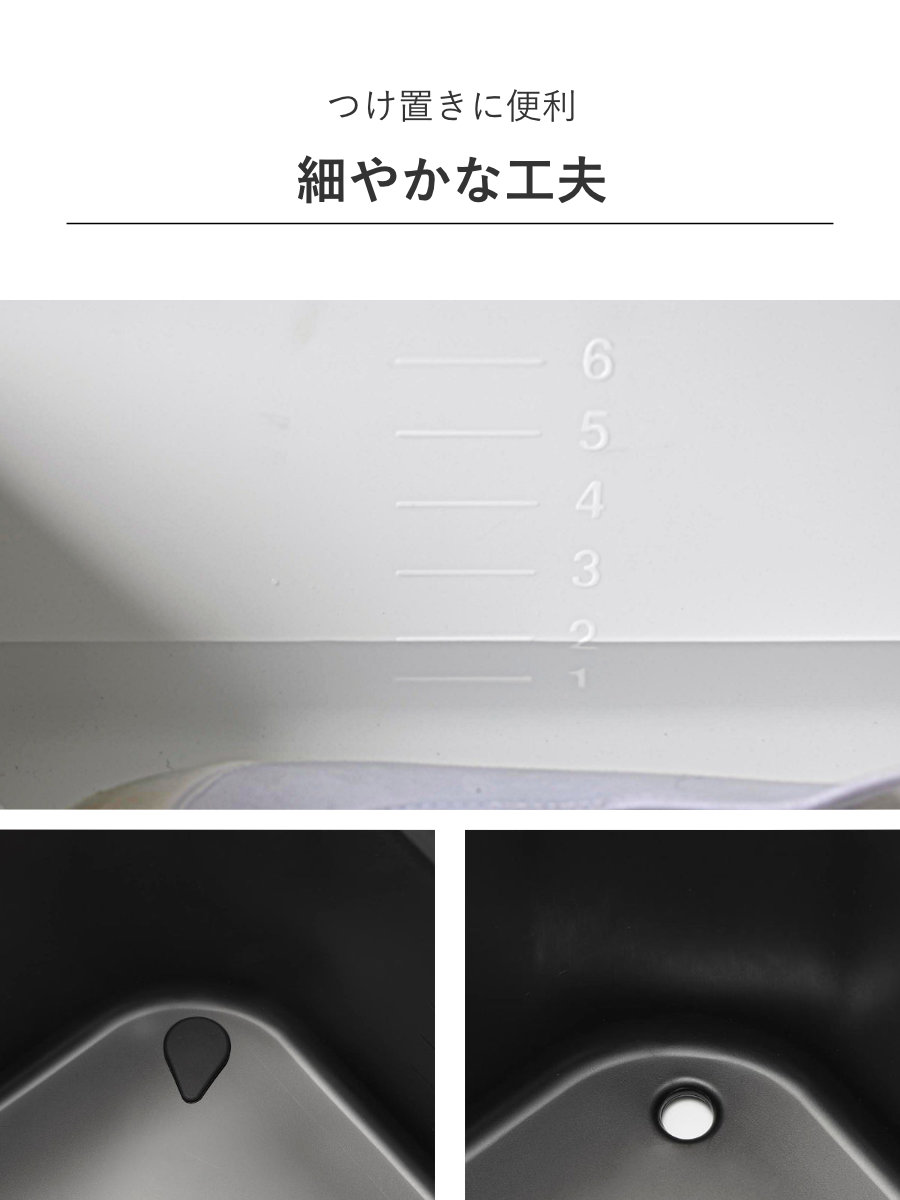 内側に6Lまでのメモリがあります。つけ置き洗い時の洗剤の分量が計りやすくなります。バケツの底にはシリコーン製の水抜き栓があるので、排水も簡単です。