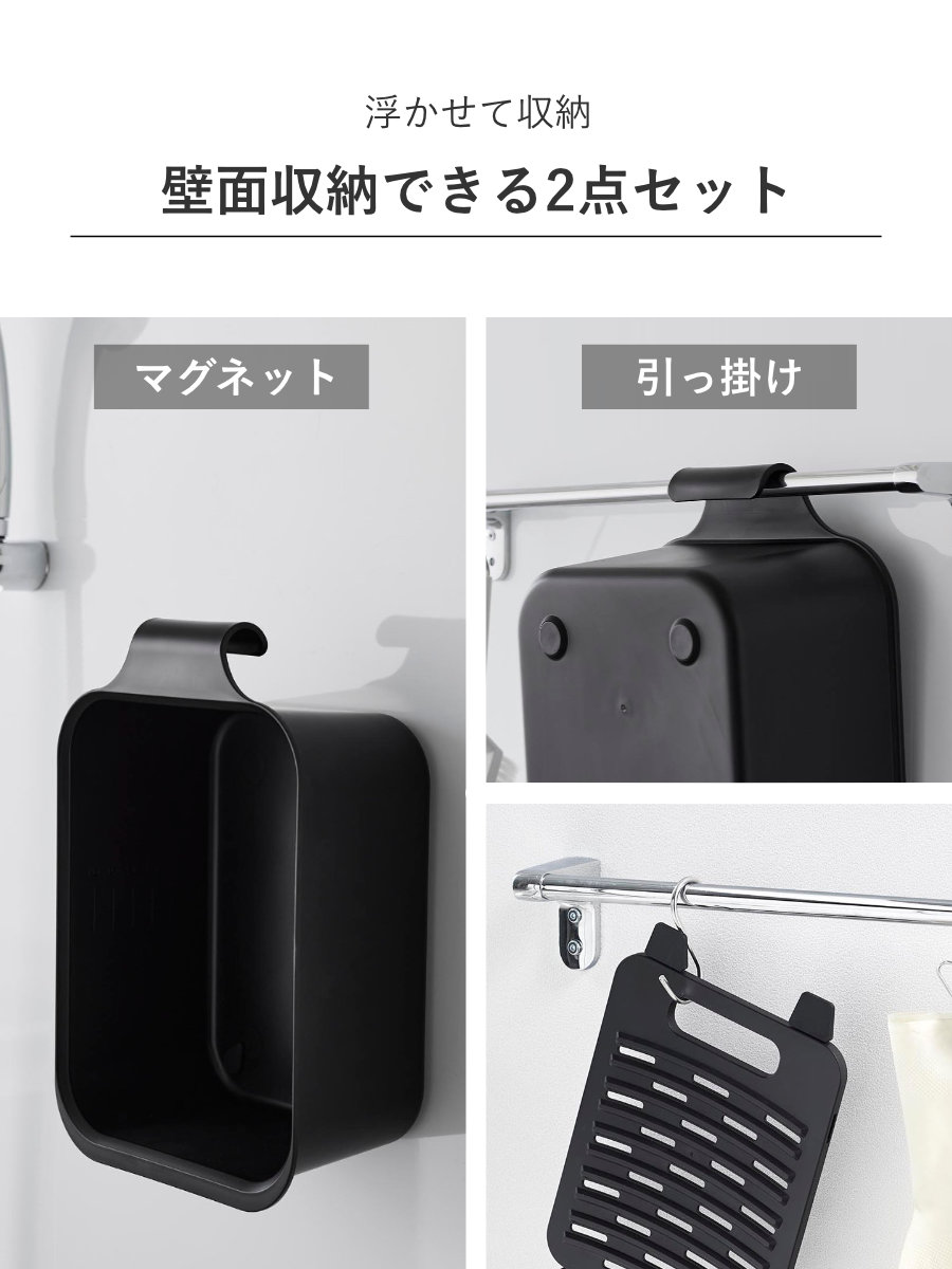 | 備考 | 【マグネット&引っ掛けバケツ】 取り付け可能な壁面: マグネットがつく平らな面・スチール壁面 【浸け置き板】 取り付け可能なバケツ: 角型で次のいずれかのサイズのもの・内寸の一辺が約22cmで、他辺が17cm以上・内寸の一辺が約18cmで、他辺が21.5cm以上 ※開口部が円形のバケツにはご使用いただけません。 ※サイズや形状、素材、表面仕上げ等、仕様によっては取り付けできない物もあります |