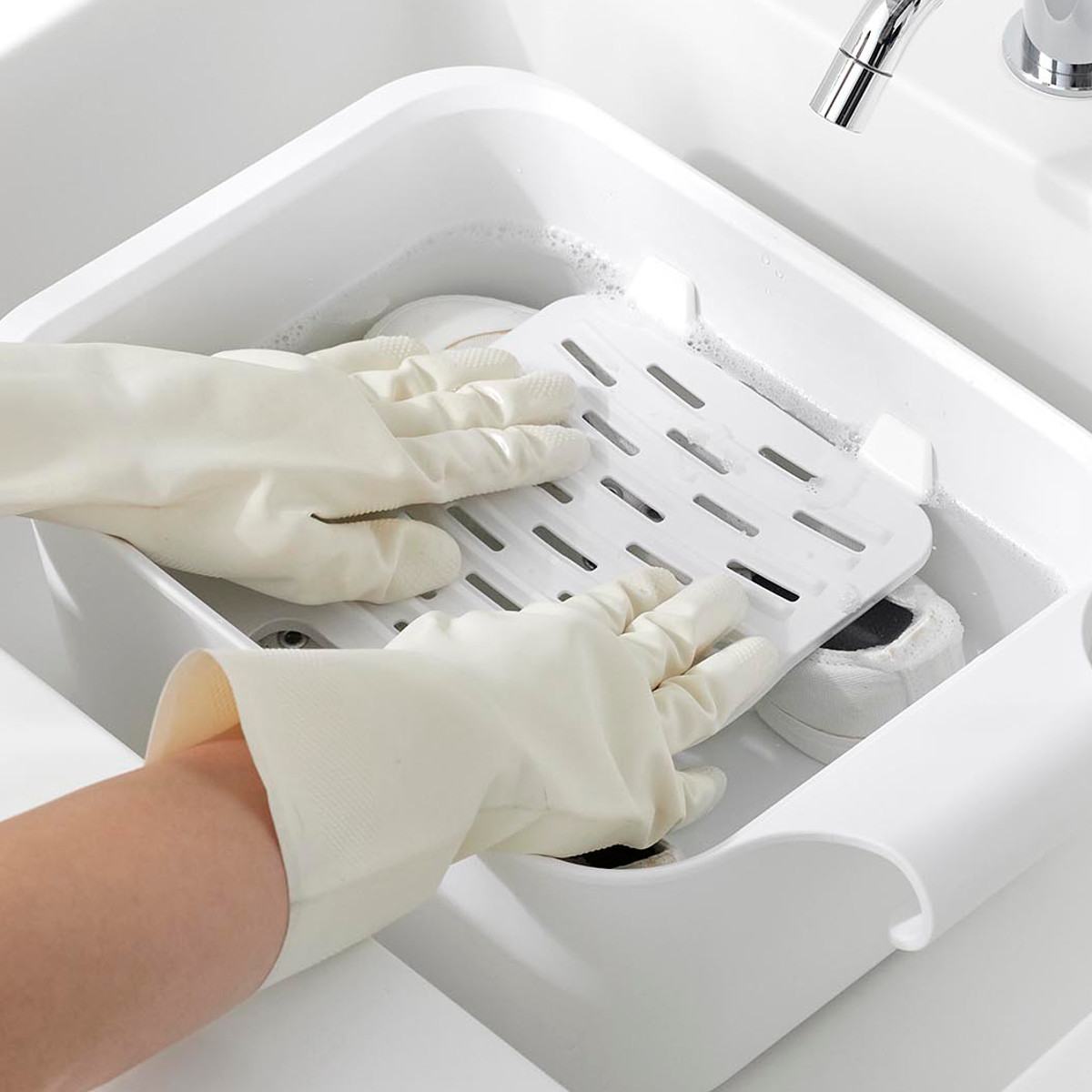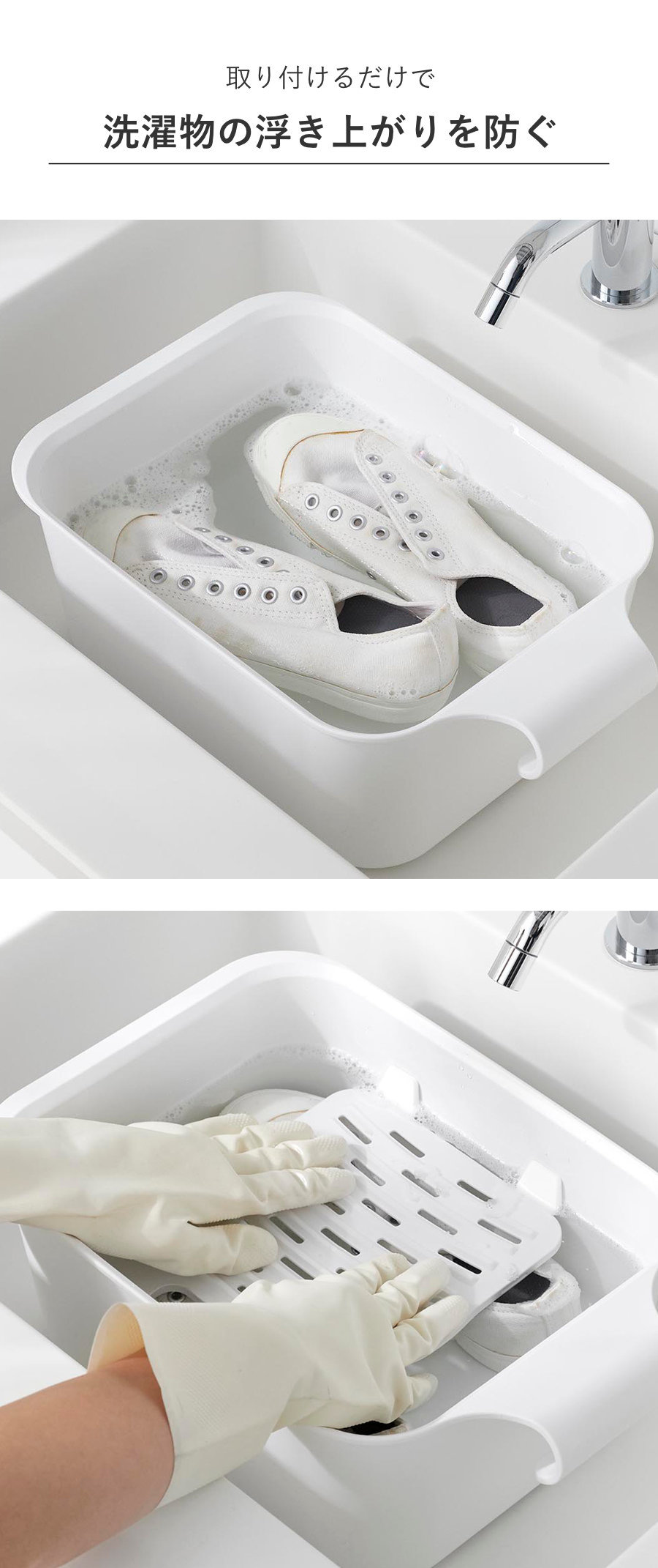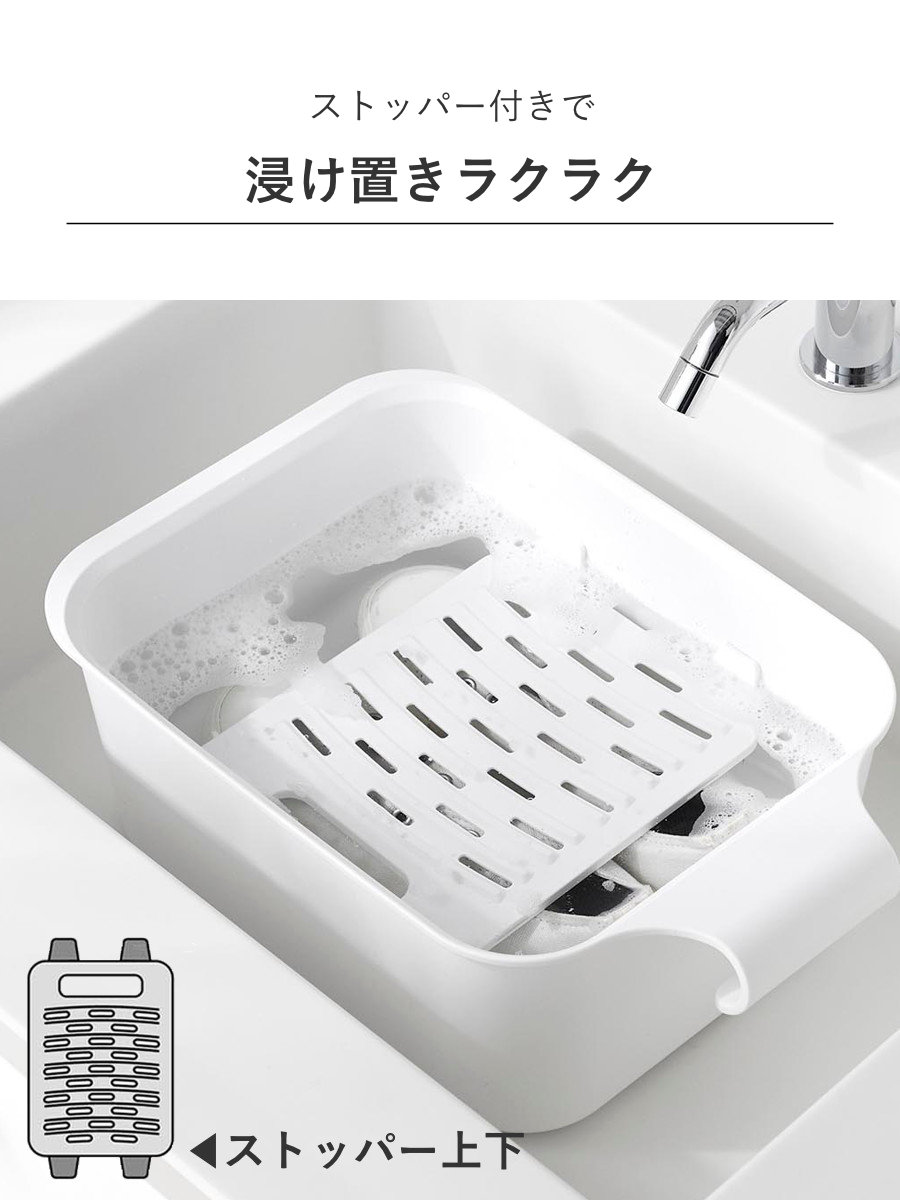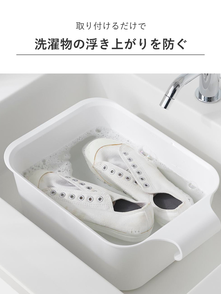 バケツと一緒に使うことで衣類や靴が浮くのを防げます。シリコーン製のストッパーで浸け置き板を固定し、衣類や靴を押さえます。
