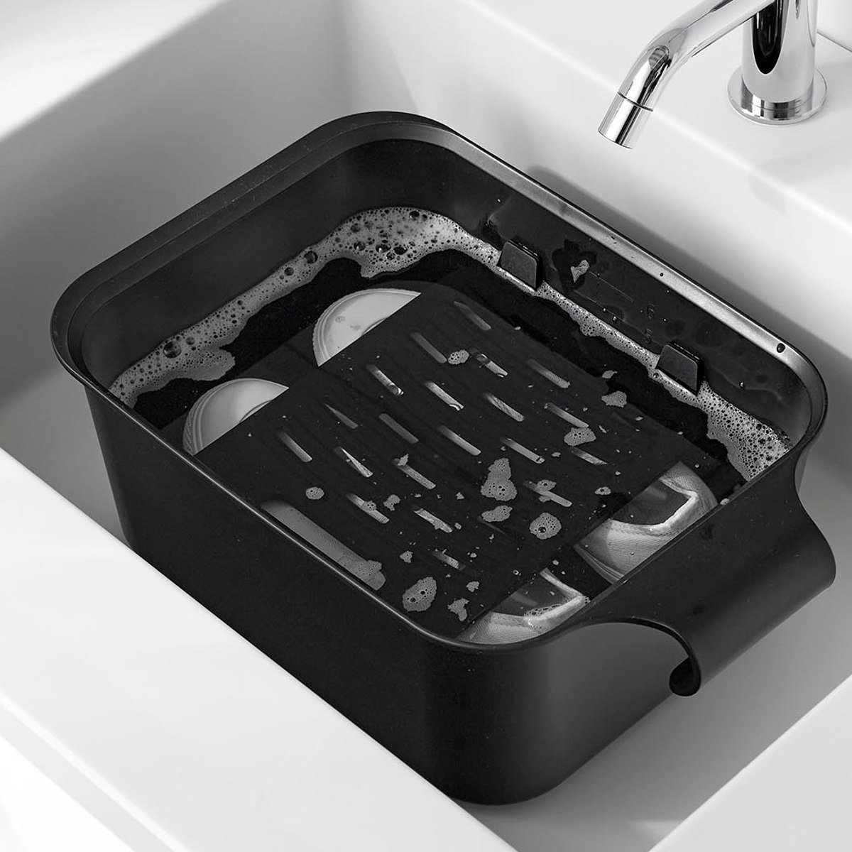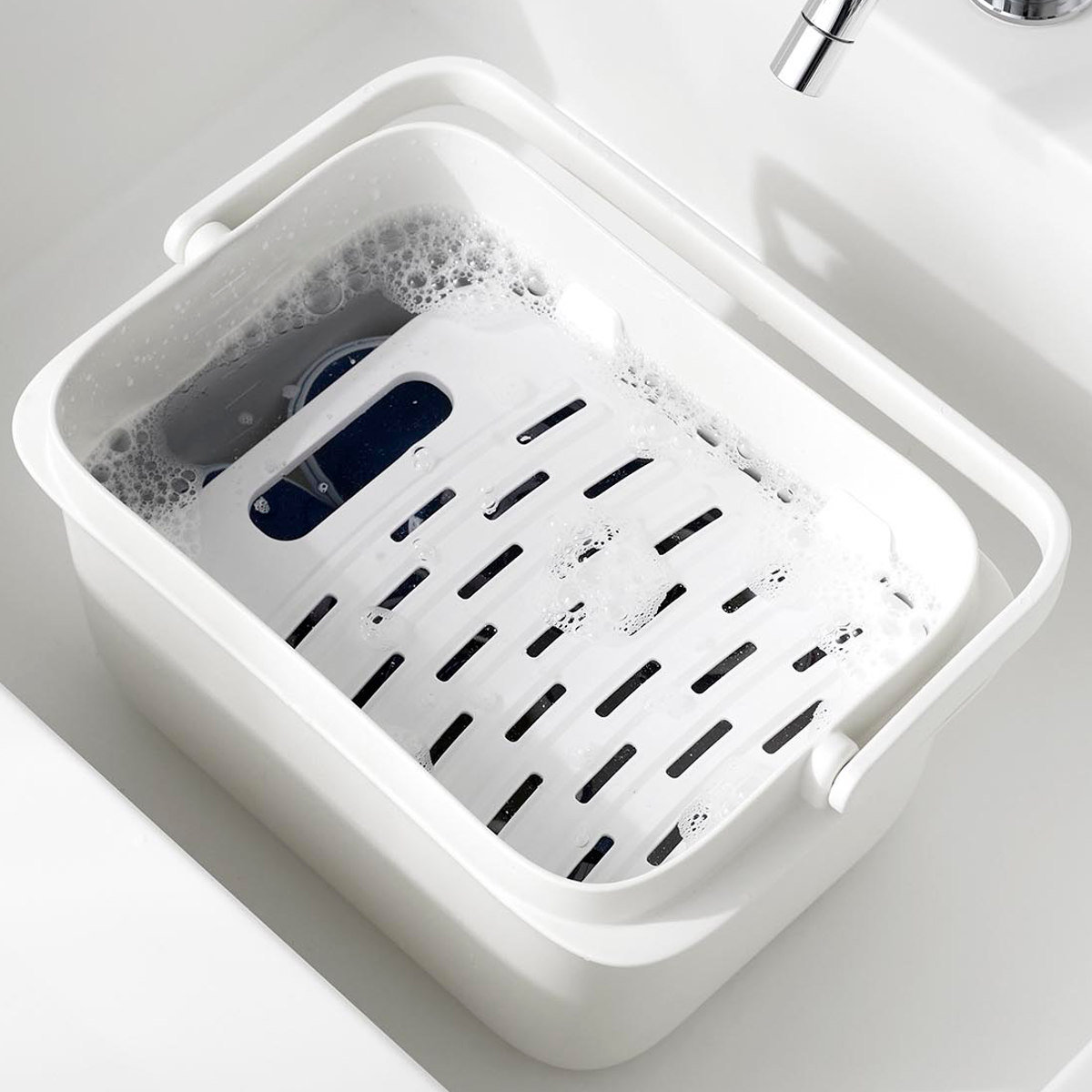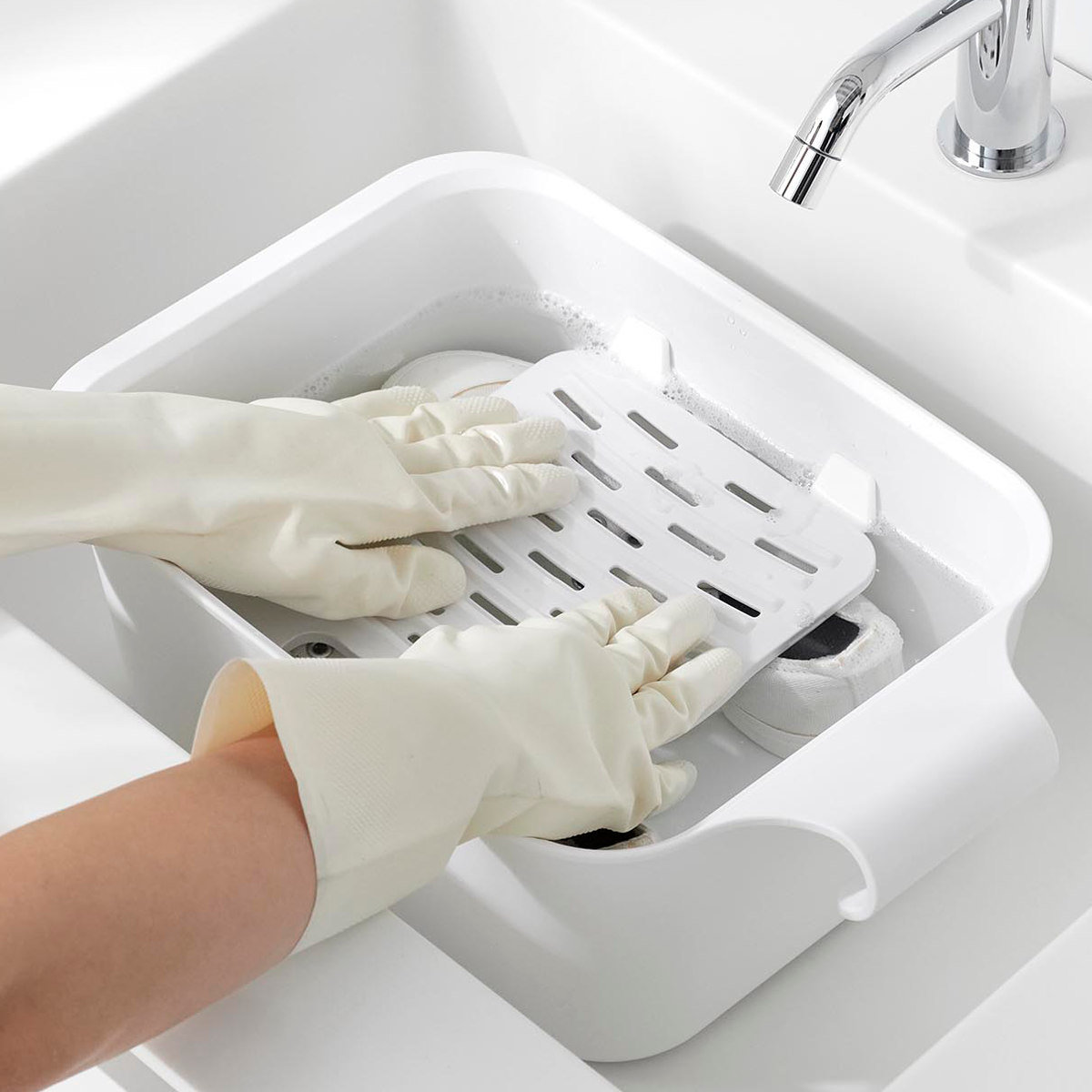 バケツと一緒に使うことで衣類や靴が浮くのを防げます。シリコーン製のストッパーで浸け置き板を固定し、衣類や靴を押さえます。