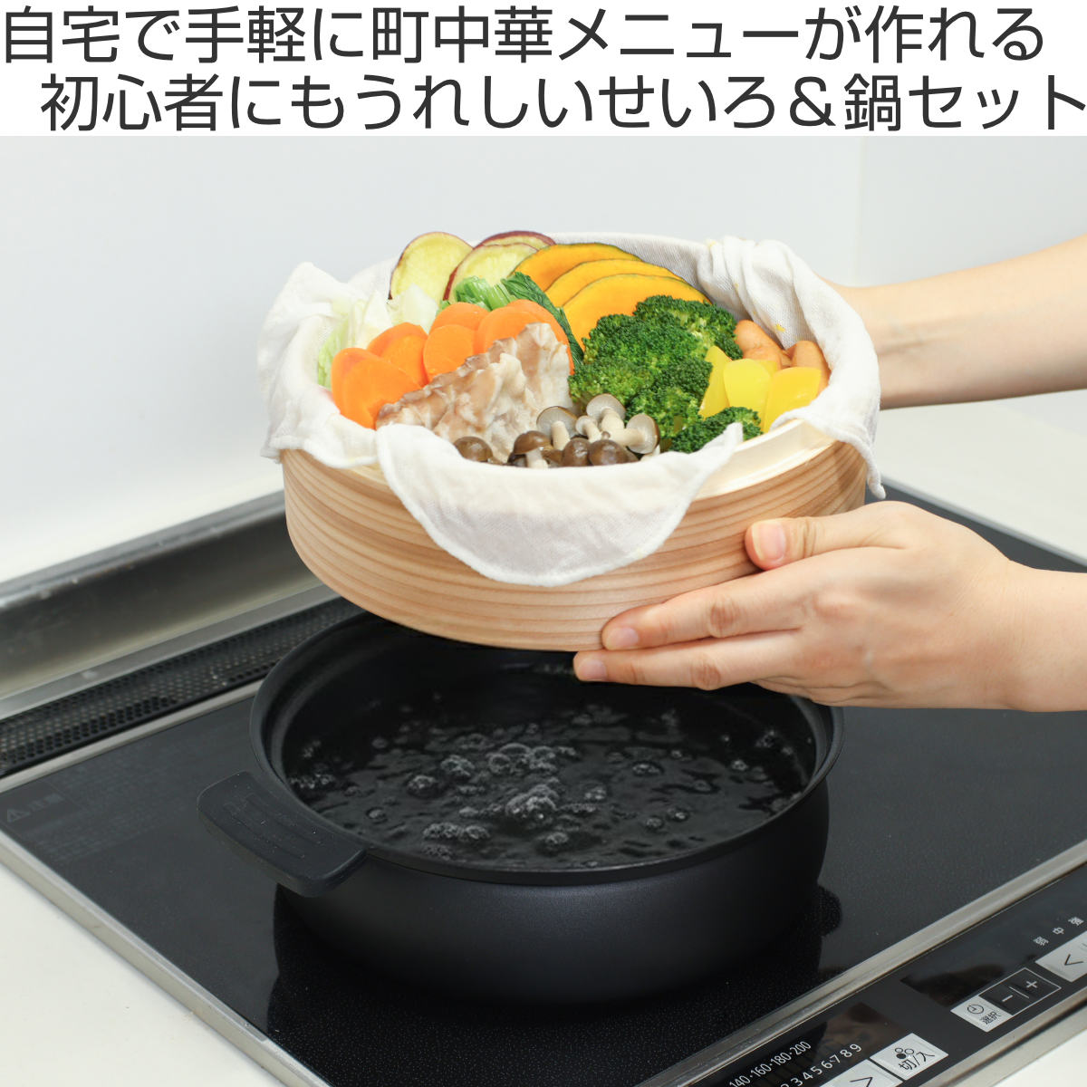 お家で手軽にヘルシーな蒸し料理が楽しめる【せいろ】と【卓上鍋】のセットです。蒸し料理は、食材の栄養や旨みを逃しにくく、素材本来のおいしさをしっかり引き出します。