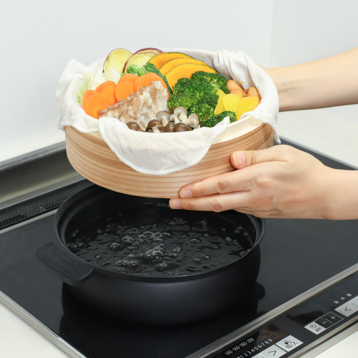 3.鍋の湯が沸騰したらせいろをのせます。