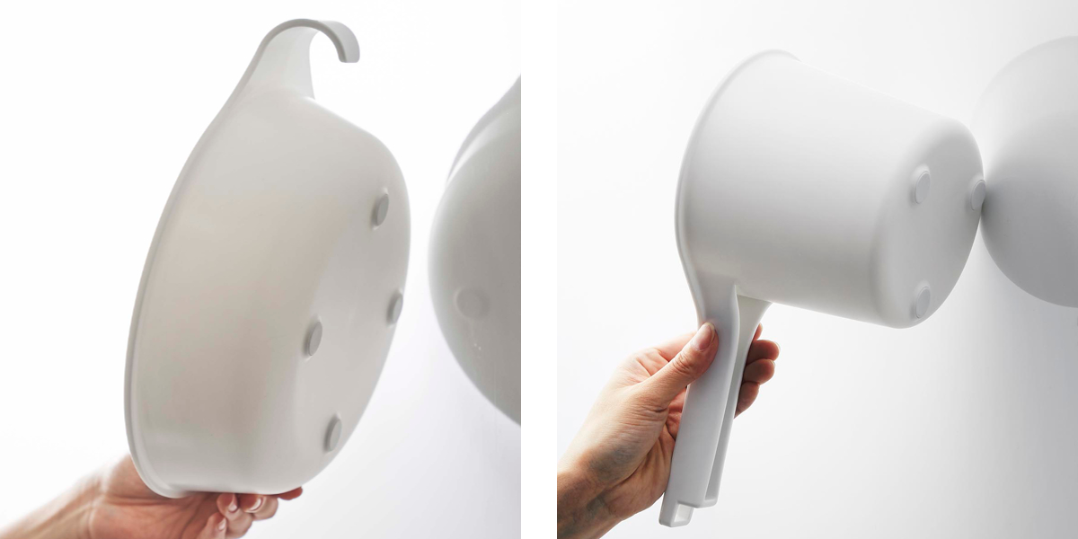 浴室のバーや扉に引っ掛けられる「風呂イス」と、マグネットで浴室の壁面にピタッとくっつく「湯おけ」と「手おけ」の3点セットです。浴室の床に直接置かないので、ヌメリや水垢が付くのを防ぎ、清潔に収納できてお掃除もラクラクです。シンプルなデザインで、お風呂のどこに置いても馴染みます。
