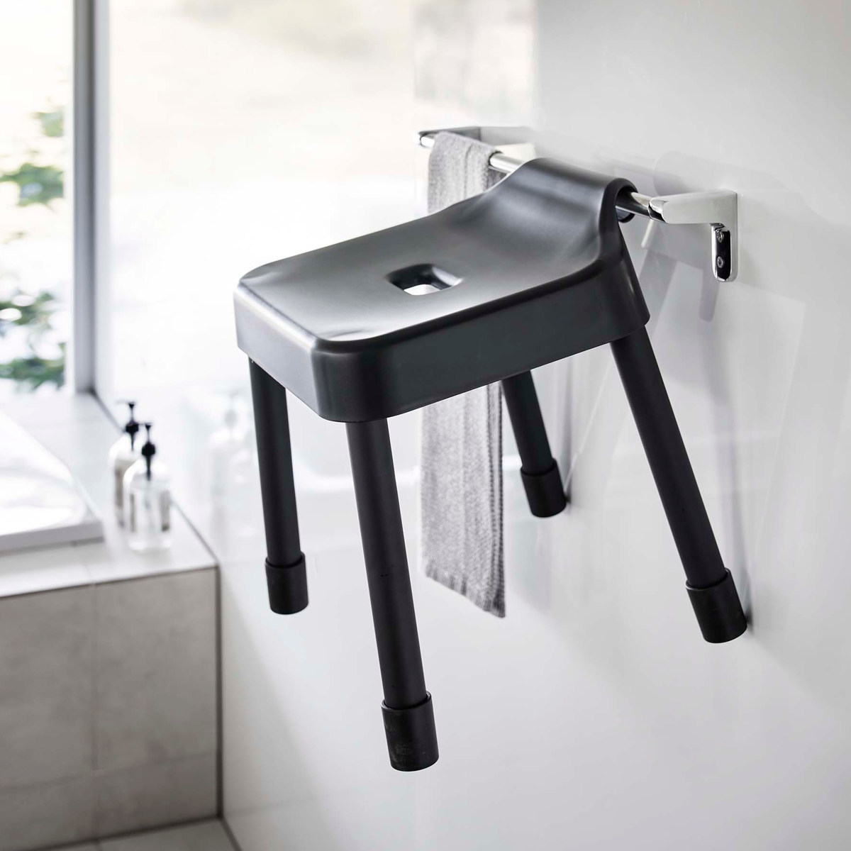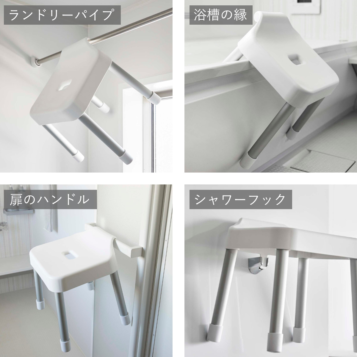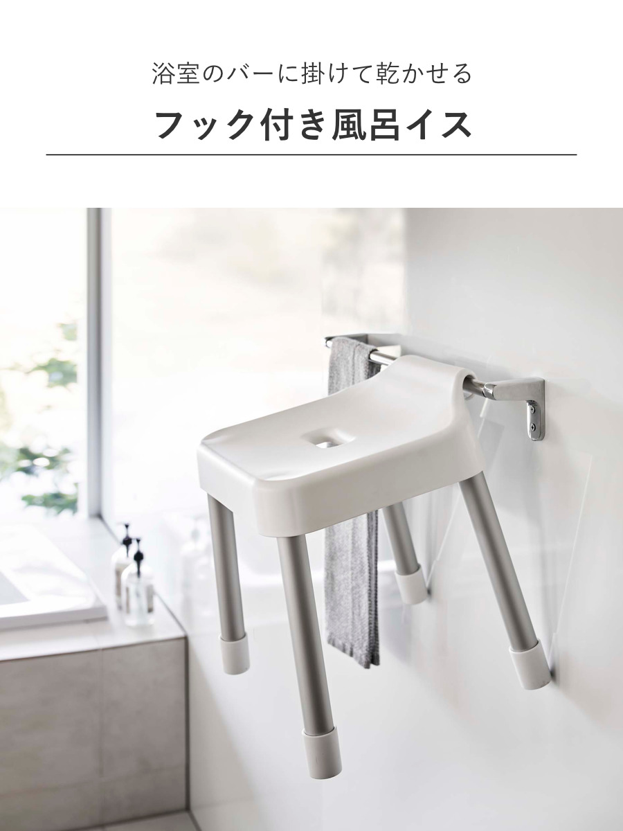 座面の高さが30cmでカウンター付きの浴室に最適なサイズです。浴室内のランドリーパイプやタオルバー、浴室扉のハンドルなどに引っ掛けられるフックが付いているので、浮かせて収納できます。背面には、シャワーフックにも掛けられるプレート付きです。