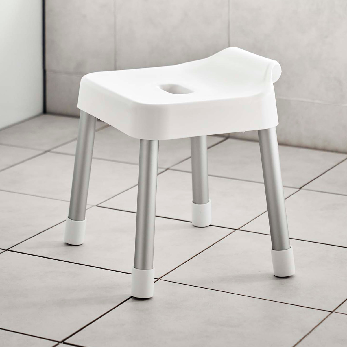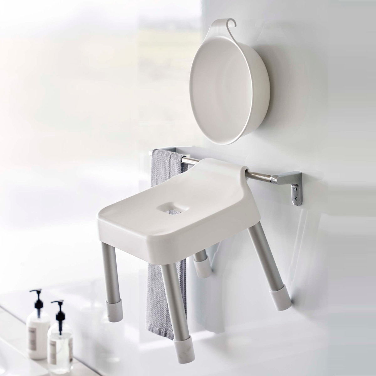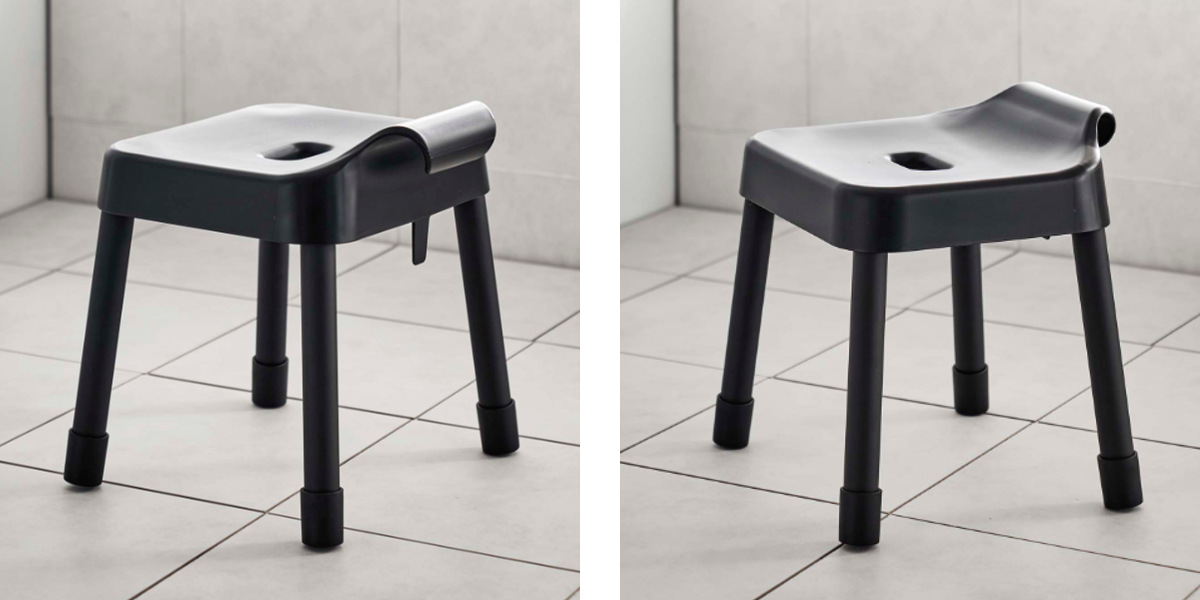 座面の高さが30cmでカウンター付きの浴室に最適なサイズです。浴室内のランドリーパイプやタオルバー、浴室扉のハンドルなどに引っ掛けられるフックが付いているので、浮かせて収納できます。背面には、シャワーフックにも掛けられるプレート付きです。