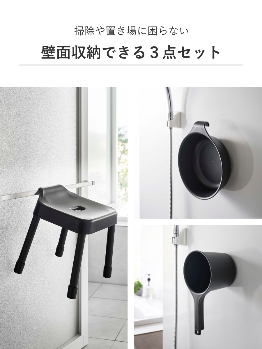 山崎実業 MIST 引っ掛け風呂イス SH30+マグネット&引っ掛け湯おけ+マグネット手おけ 3点セット ミスト ( 4903208073073 バスチェア 座面高30cm 湯桶 洗面器 手桶 壁面 浮かせる ホワイト ブラック ) 【ブラック】