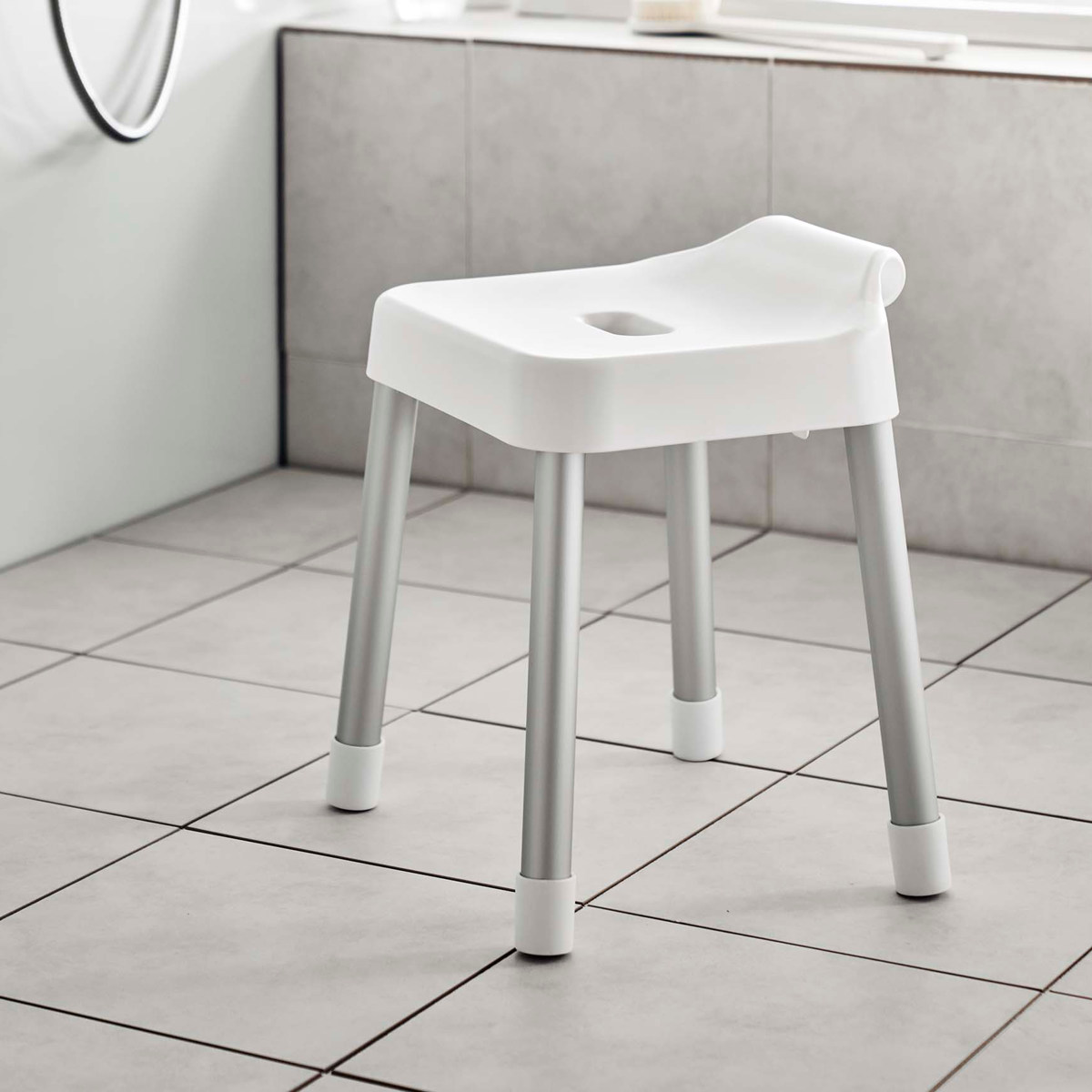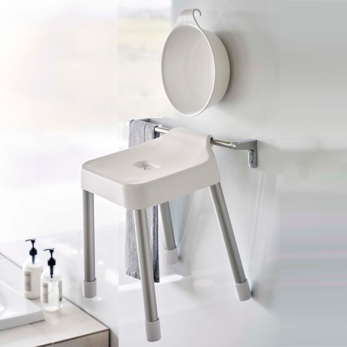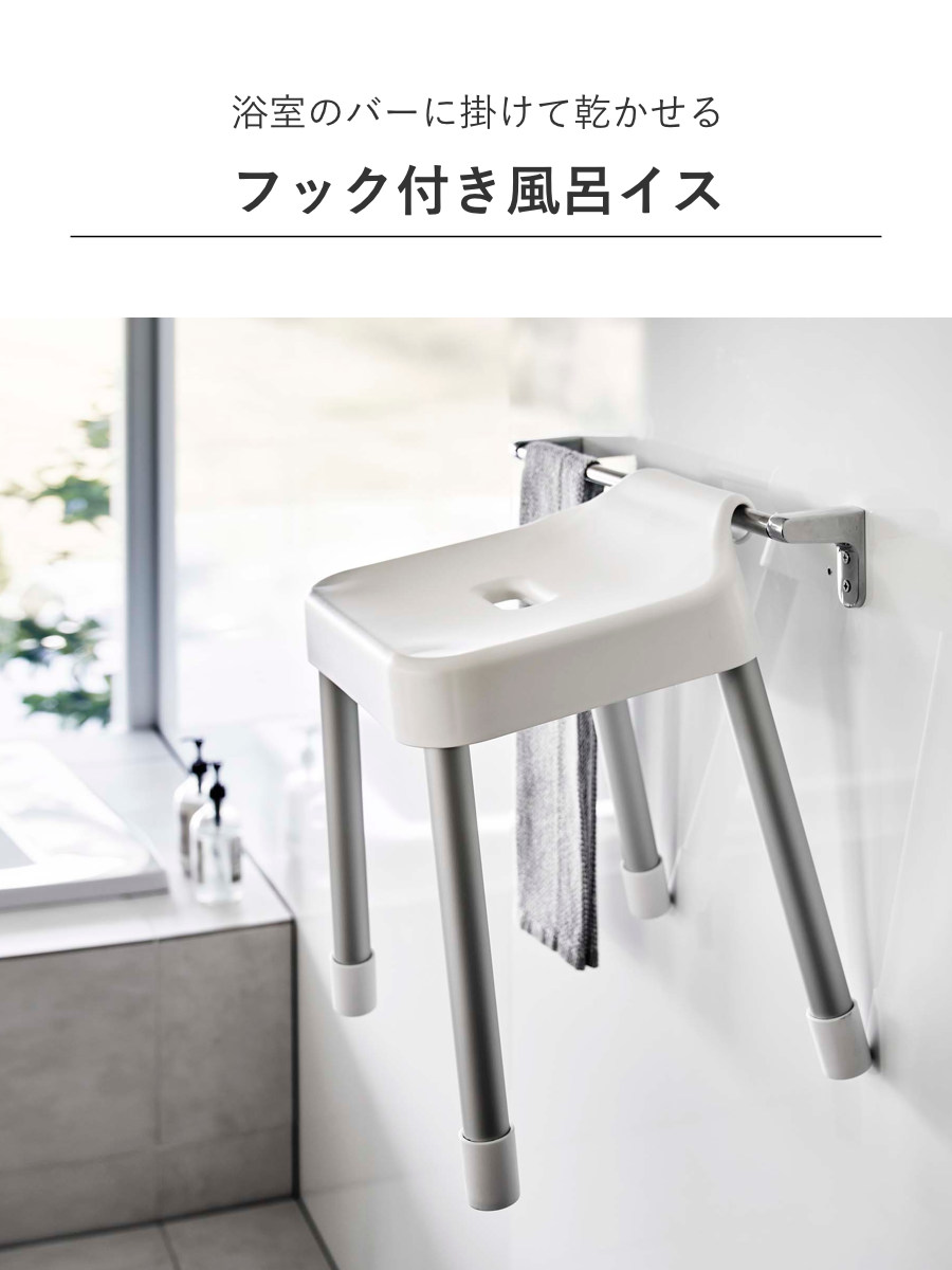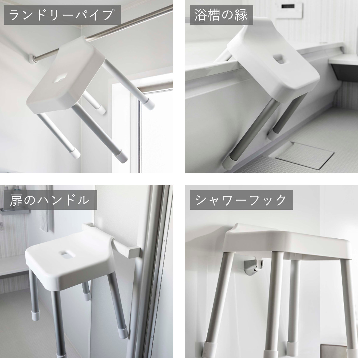 座面の高さが35cmで足腰の負担が少なく、立ち座りがラクなサイズです。浴室内のランドリーパイプやタオルバー、浴室扉のハンドルなどに引っ掛けられるフックが付いているので、浮かせて収納できます。背面には、シャワーフックにも掛けられるプレート付きです。
