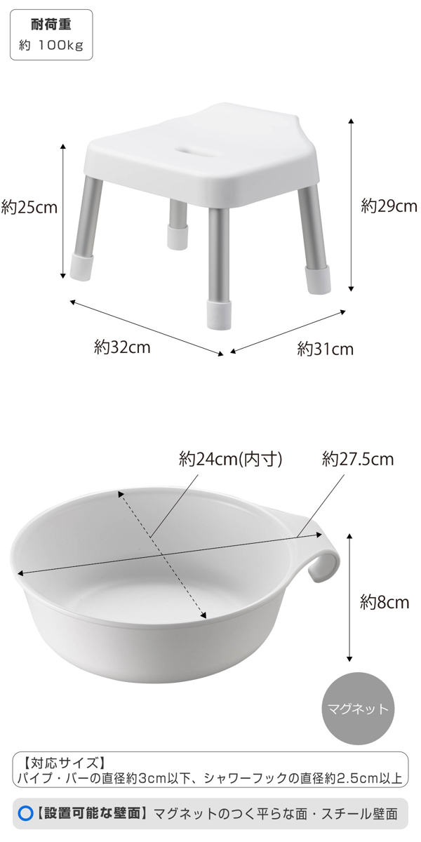 | 内容量 | 【セット内容】 引っ掛け風呂イス SH25×1 マグネット&引っ掛け湯おけ×1 |