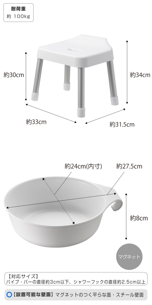 | 内容量 | 【セット内容】 引っ掛け風呂イス SH30×1 マグネット&引っ掛け湯おけ×1 |