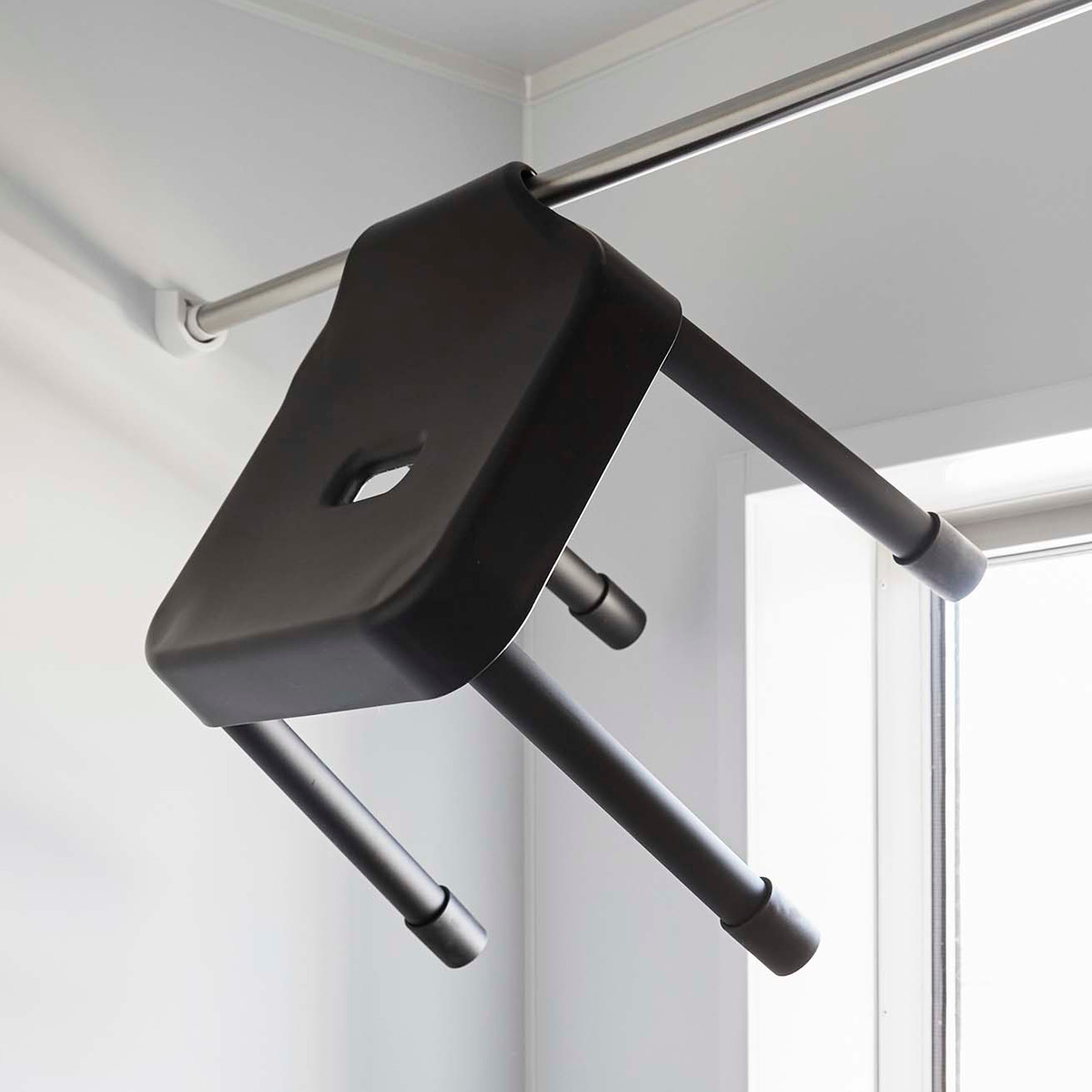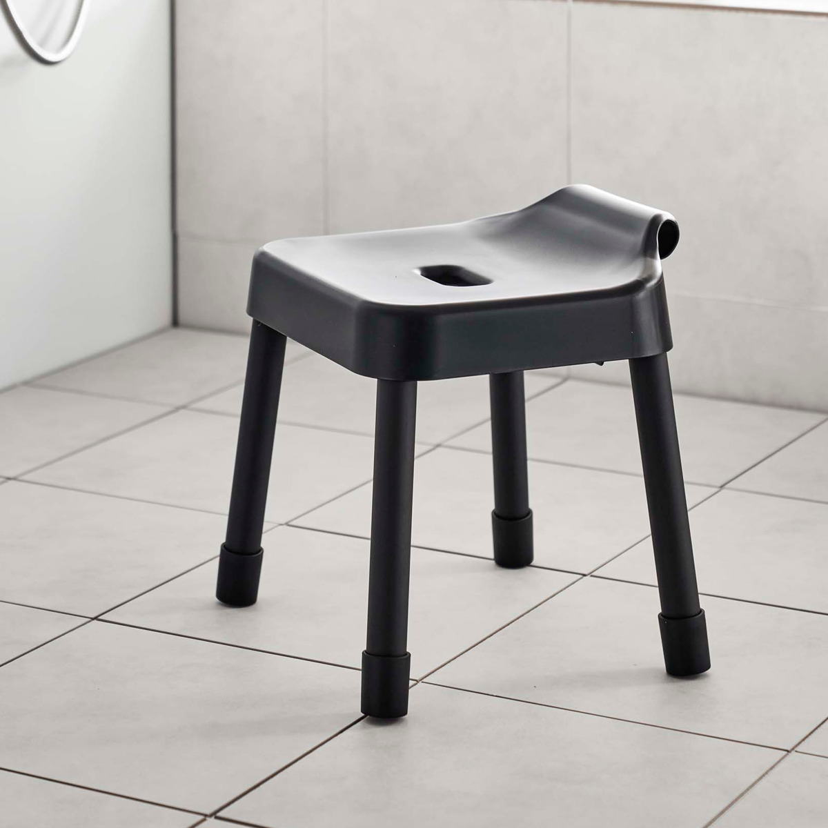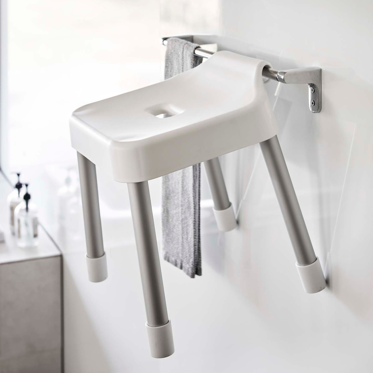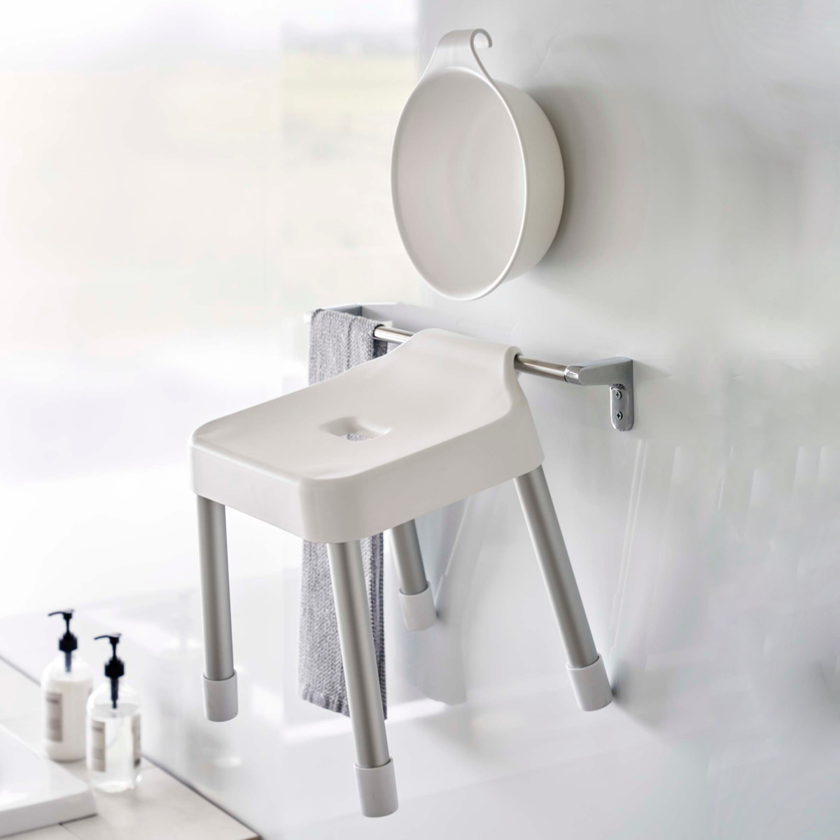 座面の高さが30cmでカウンター付きの浴室に最適なサイズです。浴室内のランドリーパイプやタオルバー、浴室扉のハンドルなどに引っ掛けられるフックが付いているので、浮かせて収納できます。背面には、シャワーフックにも掛けられるプレート付きです。