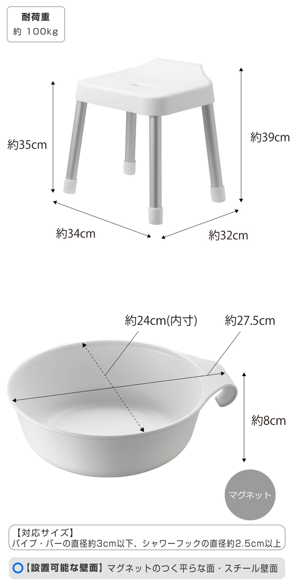 | 内容量 | 【セット内容】 引っ掛け風呂イス SH35×1 マグネット&引っ掛け湯おけ×1 |