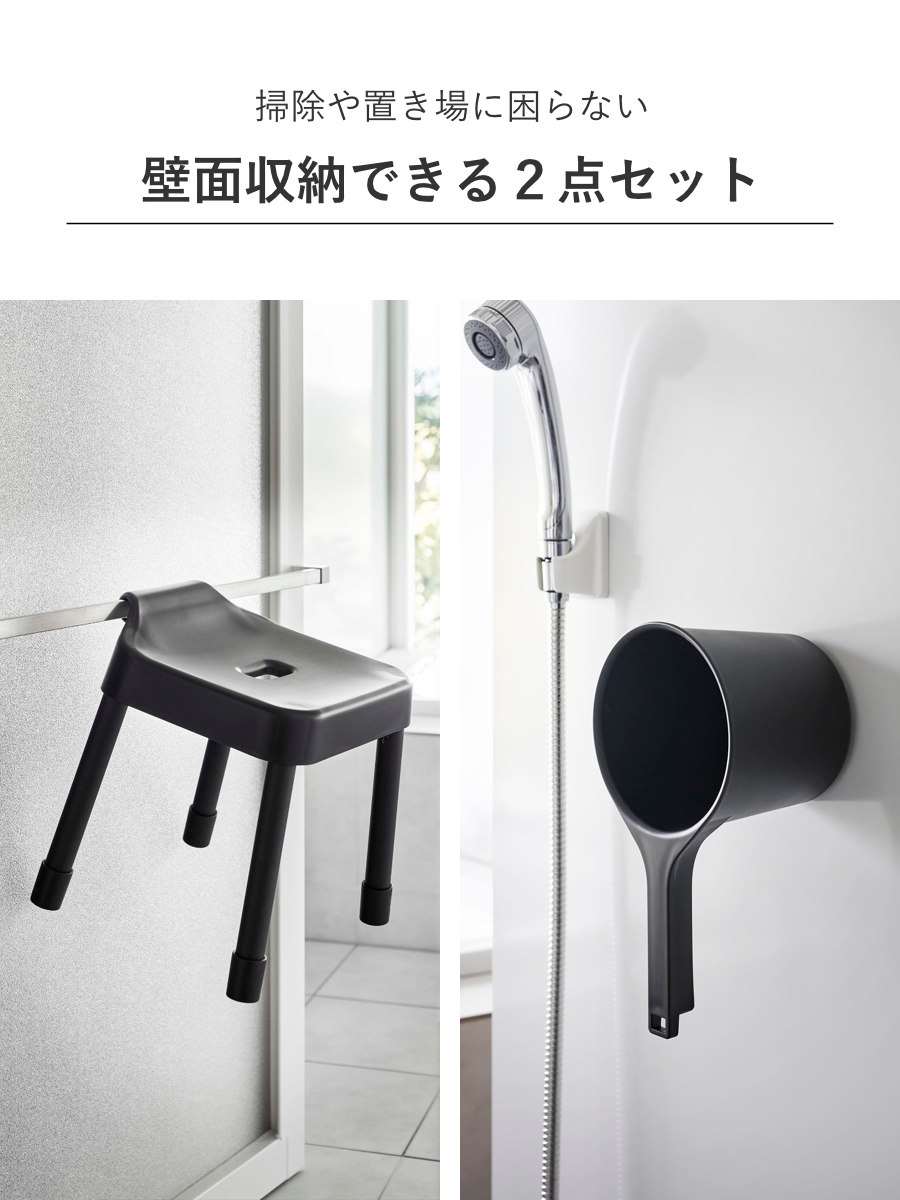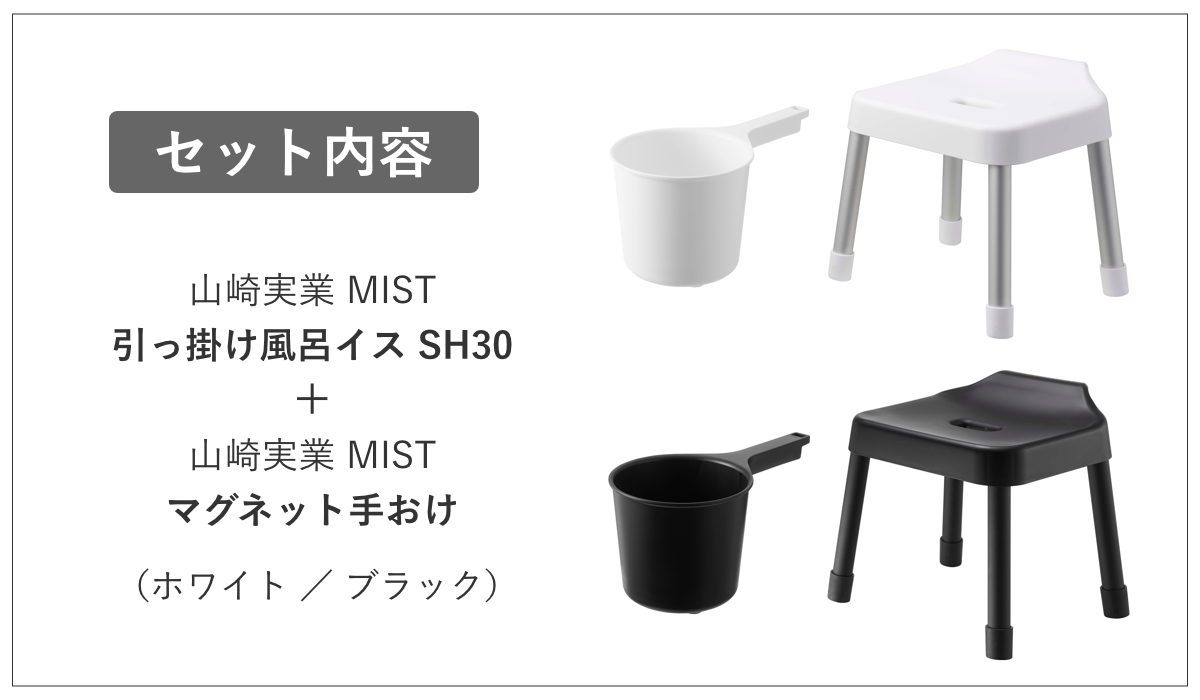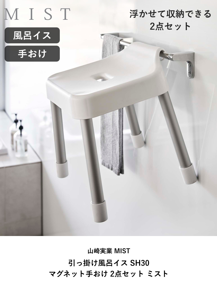 山崎実業 MIST 引っ掛け風呂イス SH30+マグネット手おけ 2点セット ミスト ( 4903208073073 バスチェア 座面高30cm 洗面器 手桶 壁面 浮かせる ホワイト ブラック ) 【ホワイト】