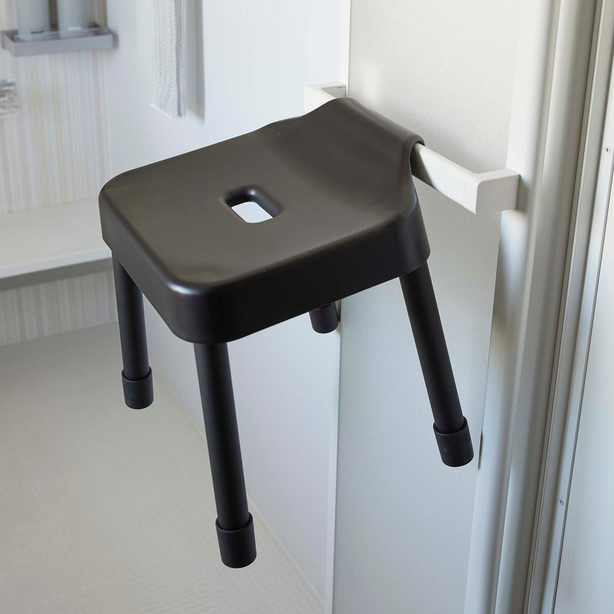 座面の高さが30cmでカウンター付きの浴室に最適なサイズです。浴室内のランドリーパイプやタオルバー、浴室扉のハンドルなどに引っ掛けられるフックが付いているので、浮かせて収納できます。背面には、シャワーフックにも掛けられるプレート付きです。