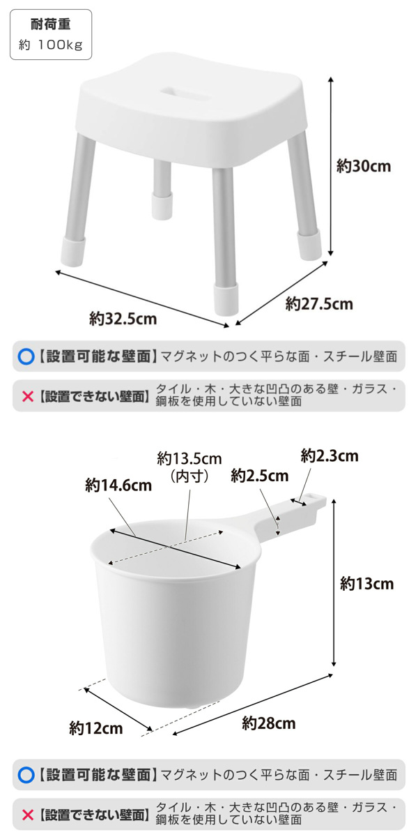 浴室の壁面にマグネットでピタっとくっつく「風呂イス」と「手おけ」の2点セットです。浴室の床に直接置かないので、ヌメリや水垢が付くのを防ぎ、清潔に収納できてお掃除もラクラクです。シンプルなデザインで、お風呂のどこに置いても馴染みます。