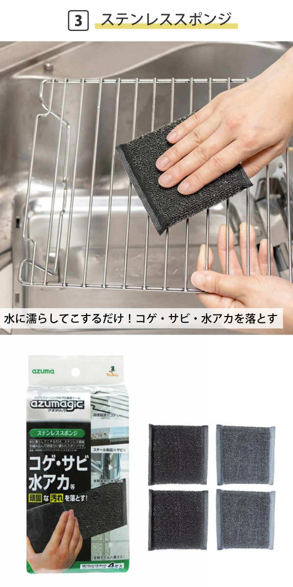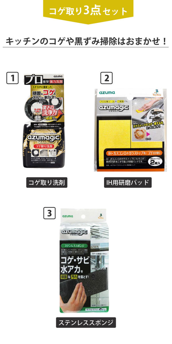 掃除セット コゲ取りセット アズマジック 年末清掃 掃除 ( 3点セット コゲ取り洗剤 コゲ取りスポンジ ステンレススポンジ コゲ キッチン コンロ 五徳 研磨パッド コゲ落とし 研磨 スポンジ サビ 水あか 強力洗浄 油汚れ グリル )