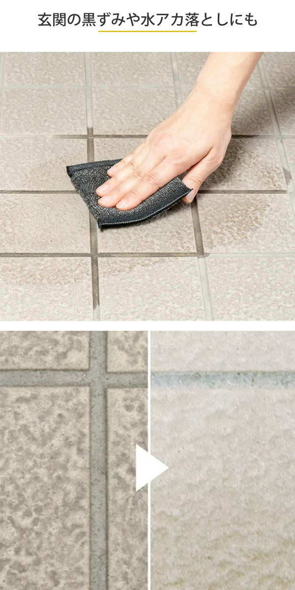 キッチン・浴室・洗面所などの水栓金具についた水アカ落としや、玄関タイルの黒ズミ落としにも便利です。