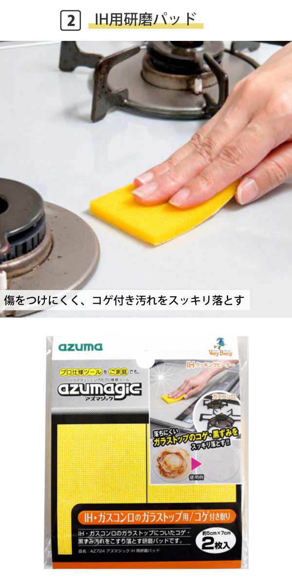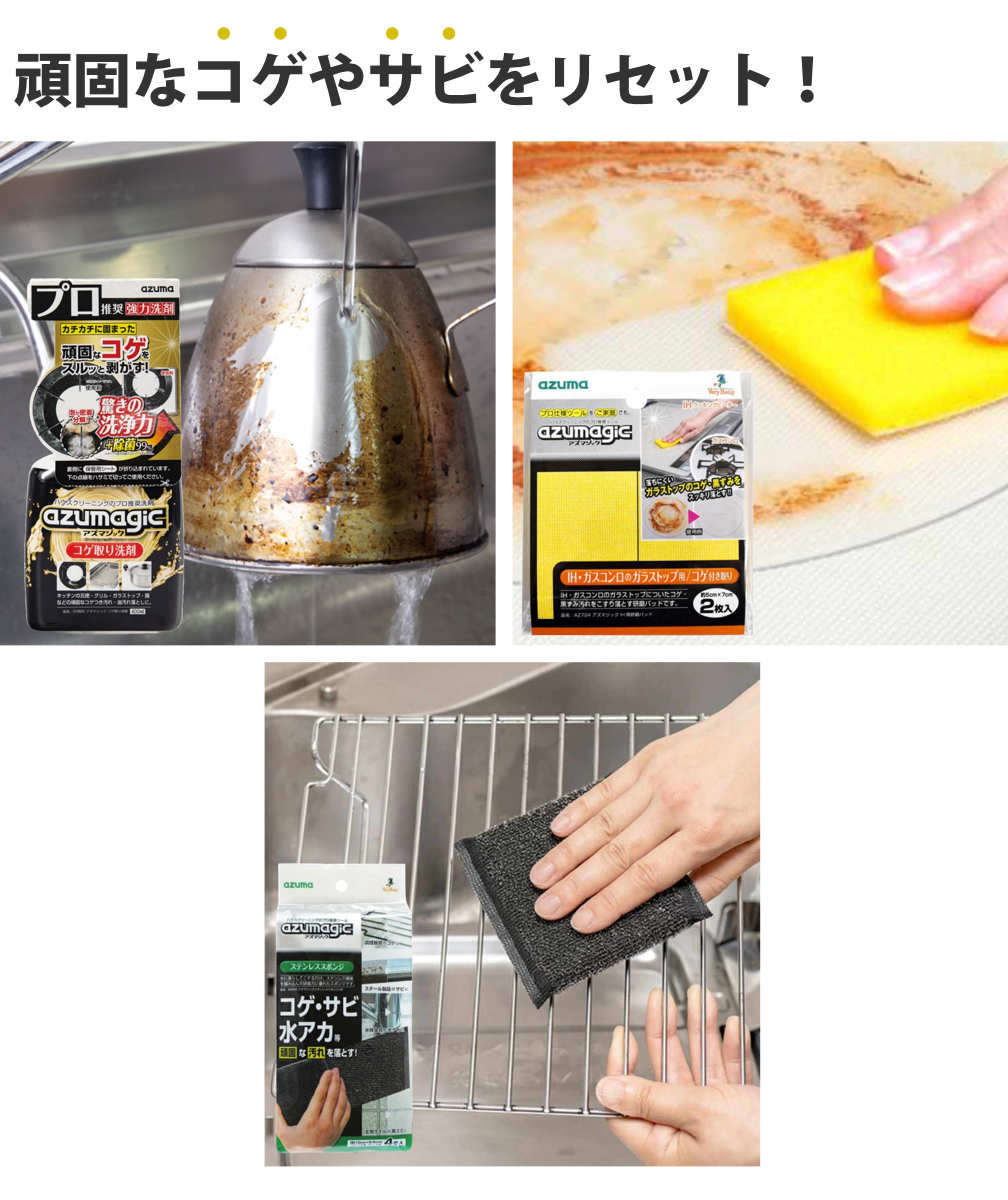 アズマジックの強力なコゲ取り洗剤に、IHやガスコンロ用の研磨パッド、水だけでコゲや錆を落とせるスポンジを組み合わせた、実用性抜群の『コゲ取り3点セット』です。