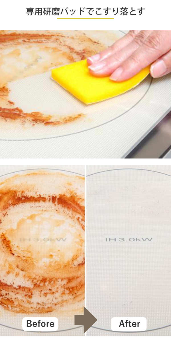 IH・ガスコンロのガラストップ専用の研磨パッドなので汚れ落ちが違います。気になるコゲや黒ずみ汚れをこすり落とします。