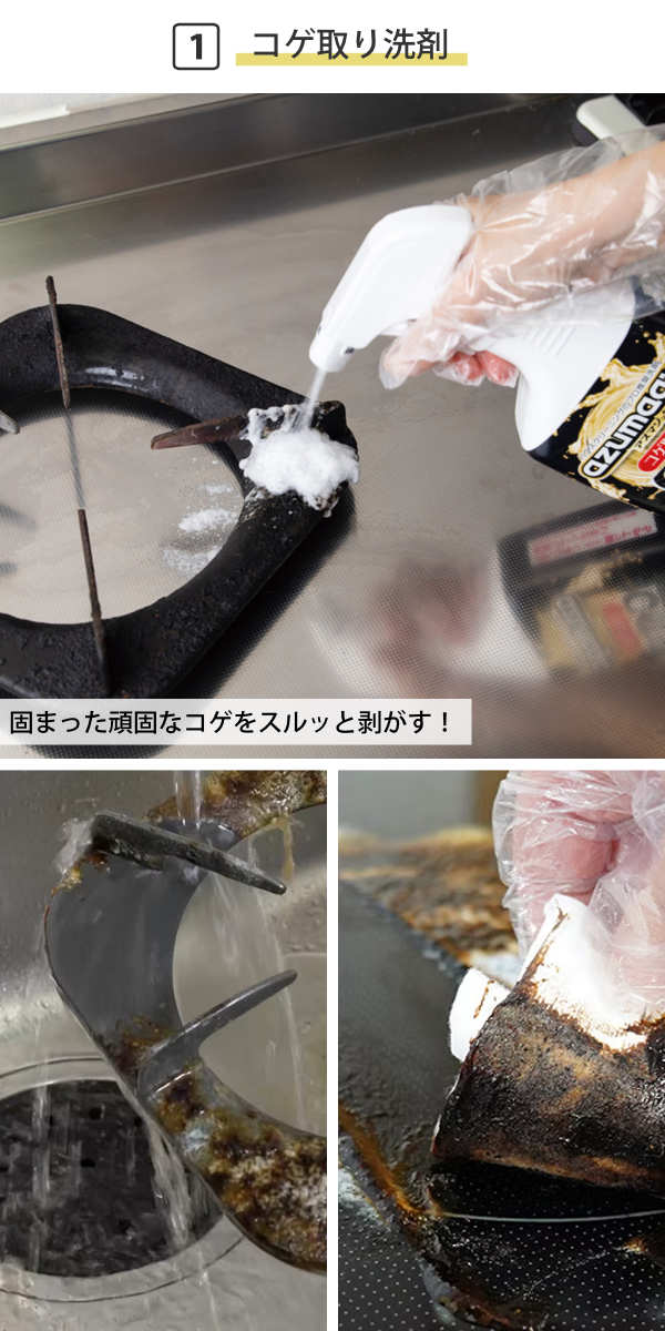 ![]() コゲ取り洗剤 | ![]() コゲ取りスポンジ | ![]() ステンレススポンジ |