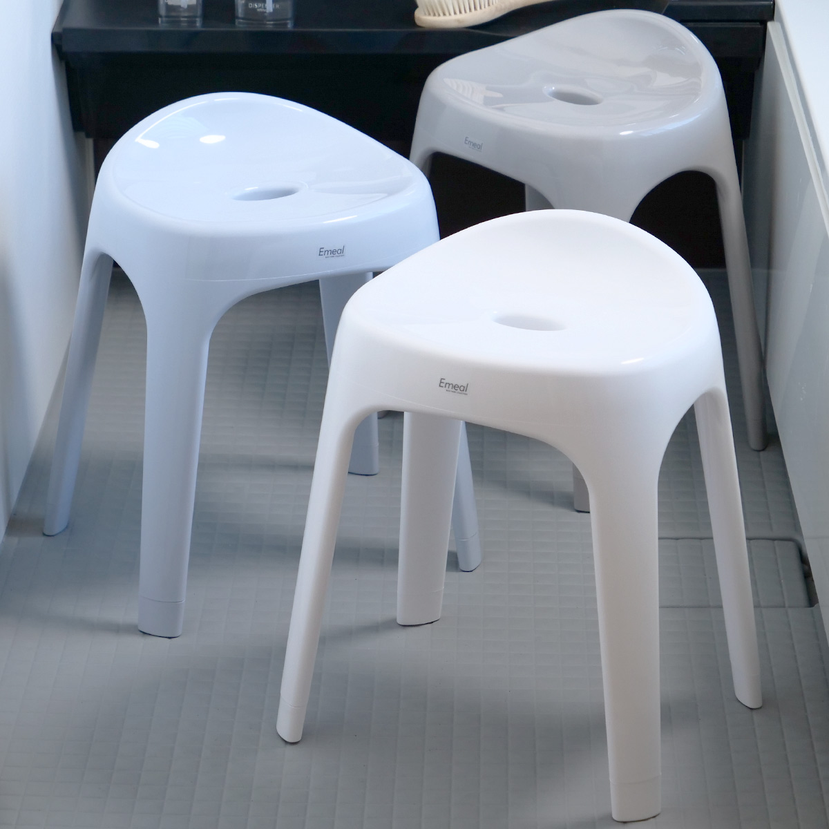 | 抜群の通気性 湿気の多い浴室だからこそ、通気性にこだわりました。脚の部分がフルオープンなので風通しがよく素早く乾燥、カビの発生を押さえます。 | 洗練されたディテール 座面は、座りやすく安定感のある丸い形状になっています。体に沿うようなカーブが体に優しくフィットします。 |