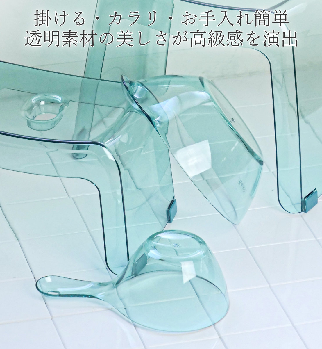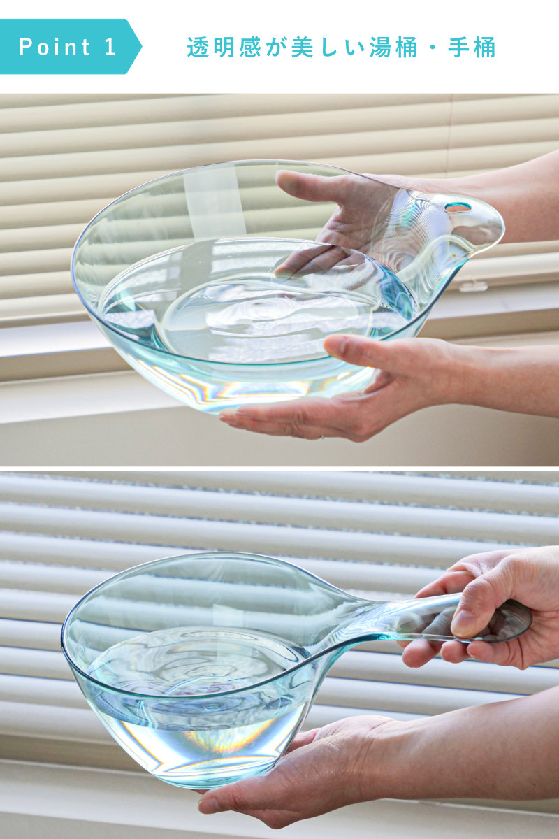 透明素材の美しさが高級感を感じさせる湯桶と手桶です。アクリルに負けない透明度の高い樹脂を採用しているため、水を入れるとキラキラと輝いて見えます。