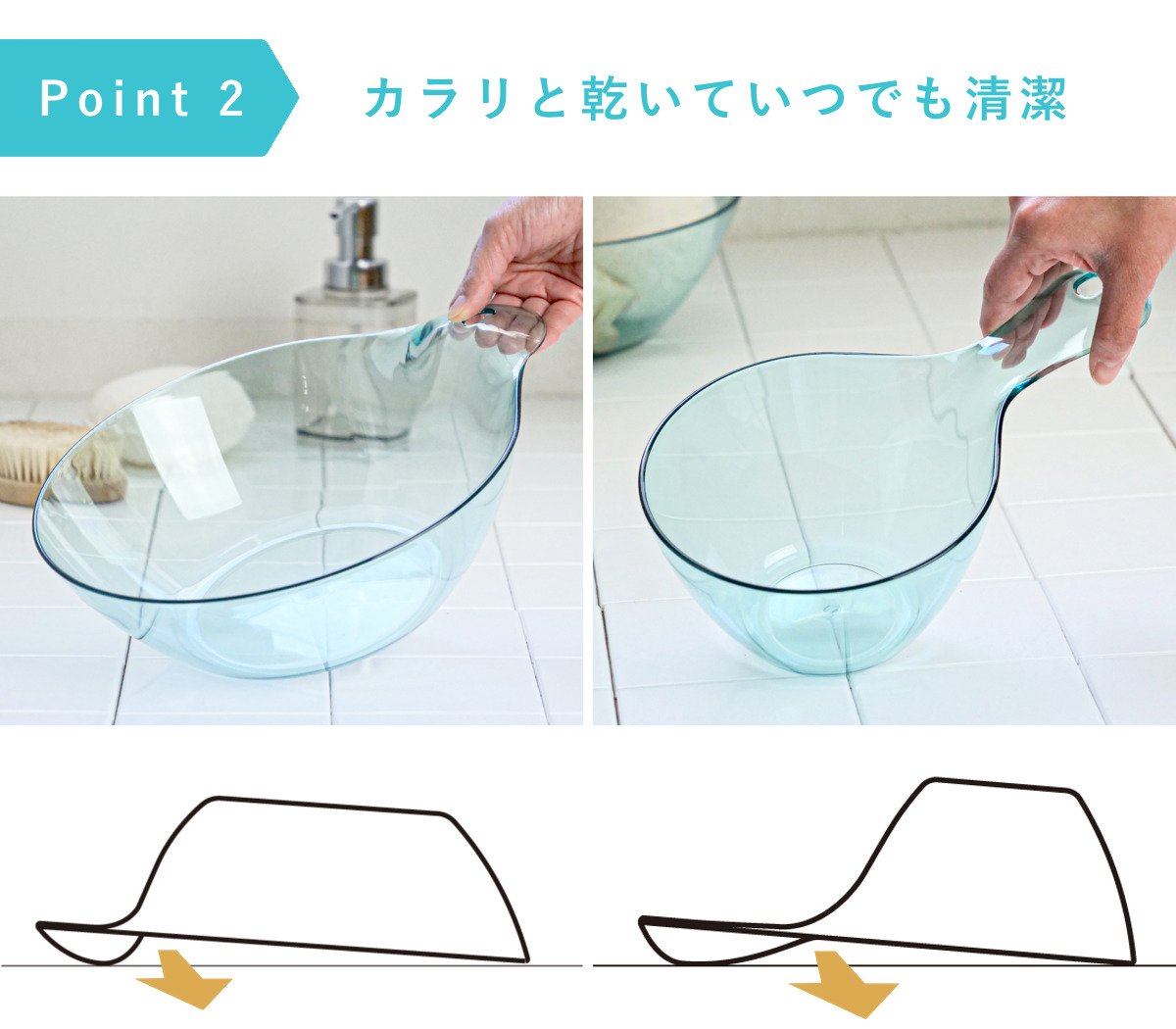 フチがフラットになっているので汚れや水分がフチに残らず、ムダな継ぎ目もないためお手入れが簡単です。また、下向きに置いても空気の通るスペースが確保できる形状になっているため乾きやすく、いつでも衛生的にお使いいただけます。
