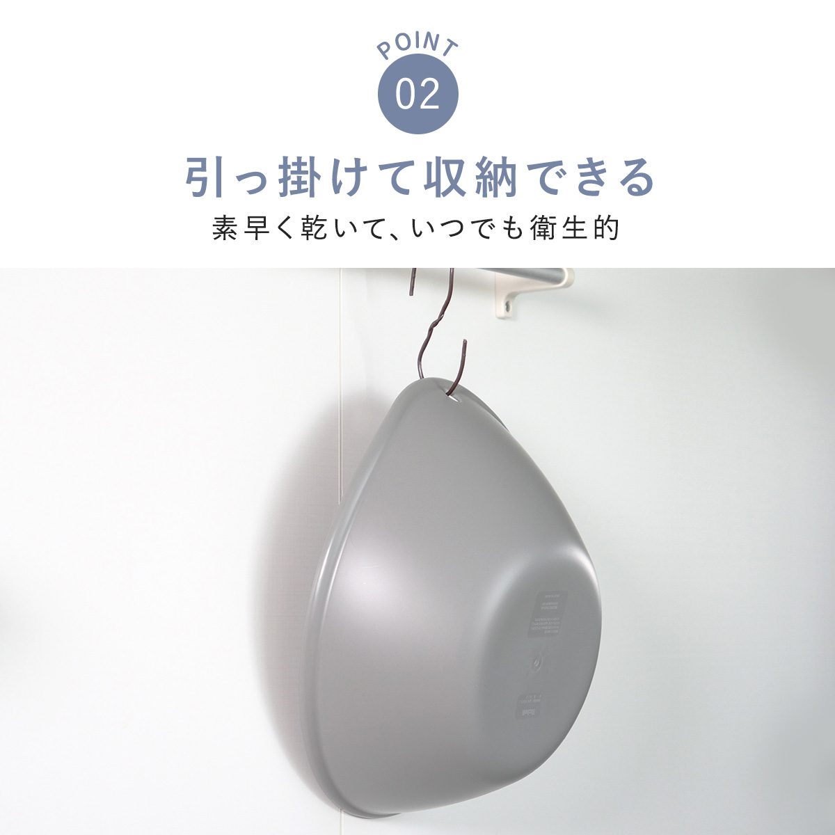 継ぎ目のない滑らかなカーブ形状にすることで、水滴や汚れがが溜まりにくくなっています。水切れも通気性も良いので、清潔に乾燥させることが出来ます。さらに抗菌効果のある銀イオン配合で、ヌルヌルや臭いの発生が抑えられます。