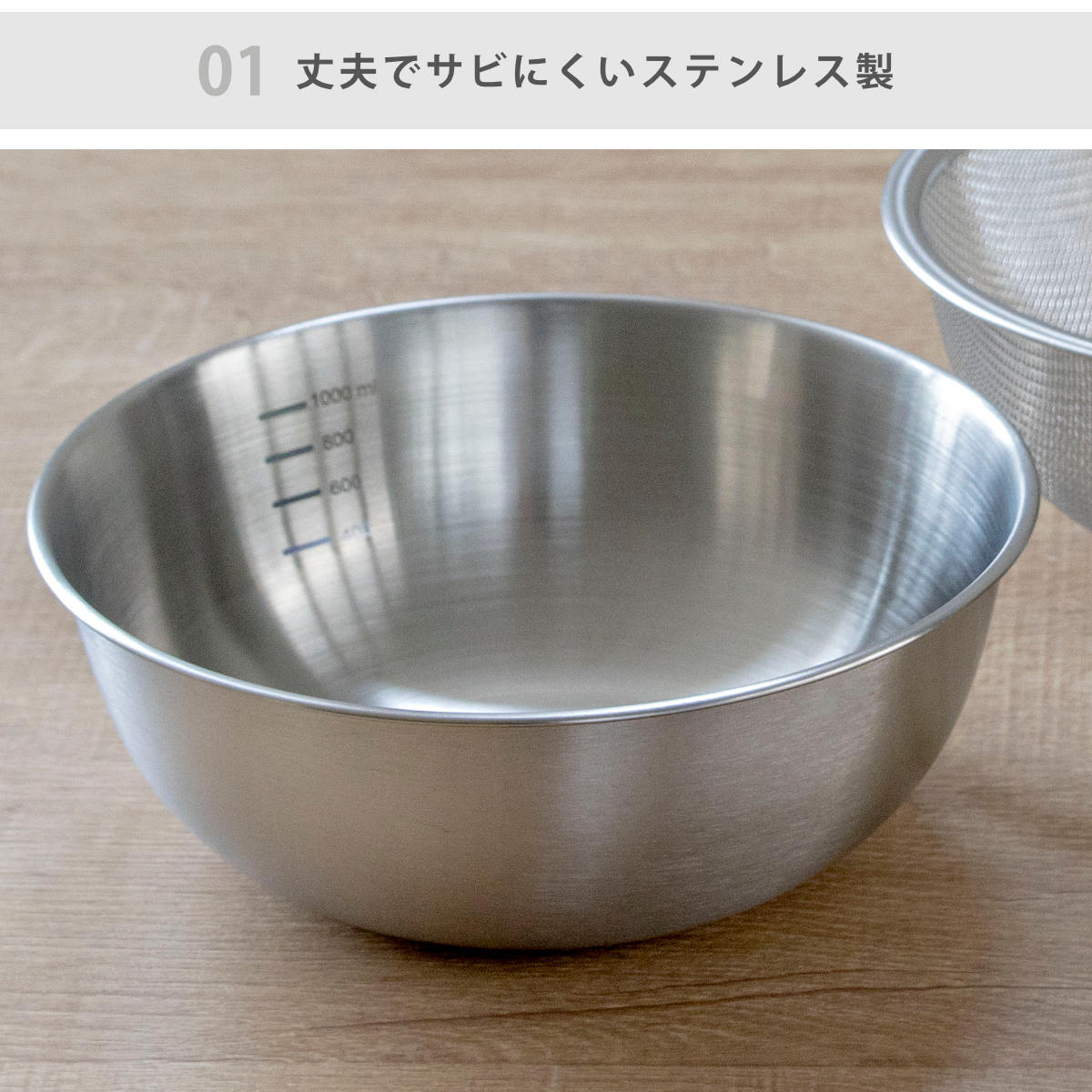 耐久性と使いやすさを兼ね備えた、ステンレス製ボウルのセットです。汚れやニオイが付きにくく、軽くて扱いやすいため、長く清潔に使えます。