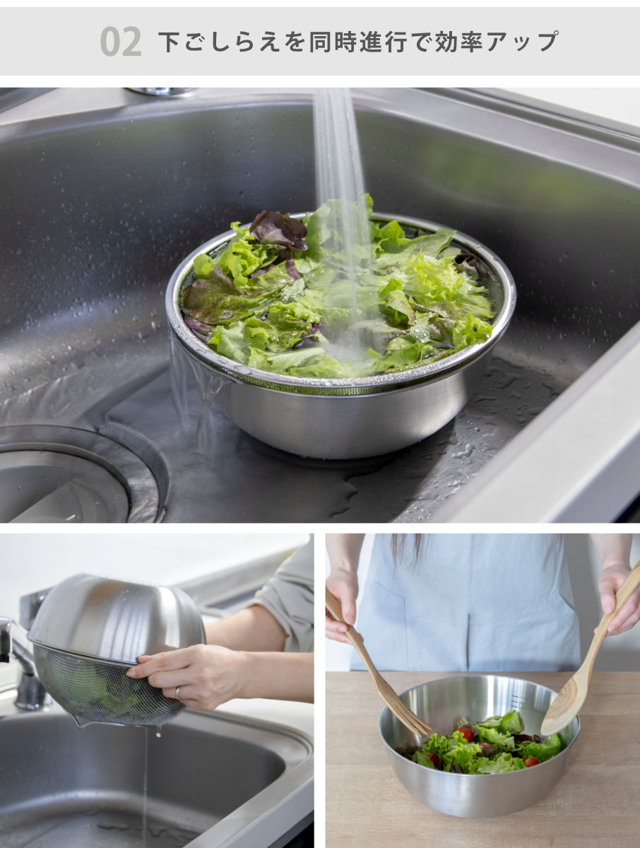 サイズ違いのボウルを使い分けることで、下ごしらえをしながら別の食材を和えたり、一時置きしたりと、作業を同時に進められます。工程ごとにボウルを入れ替える手間がなく、キッチンでの動きがスムーズになり、調理時間の短縮にもつながります。