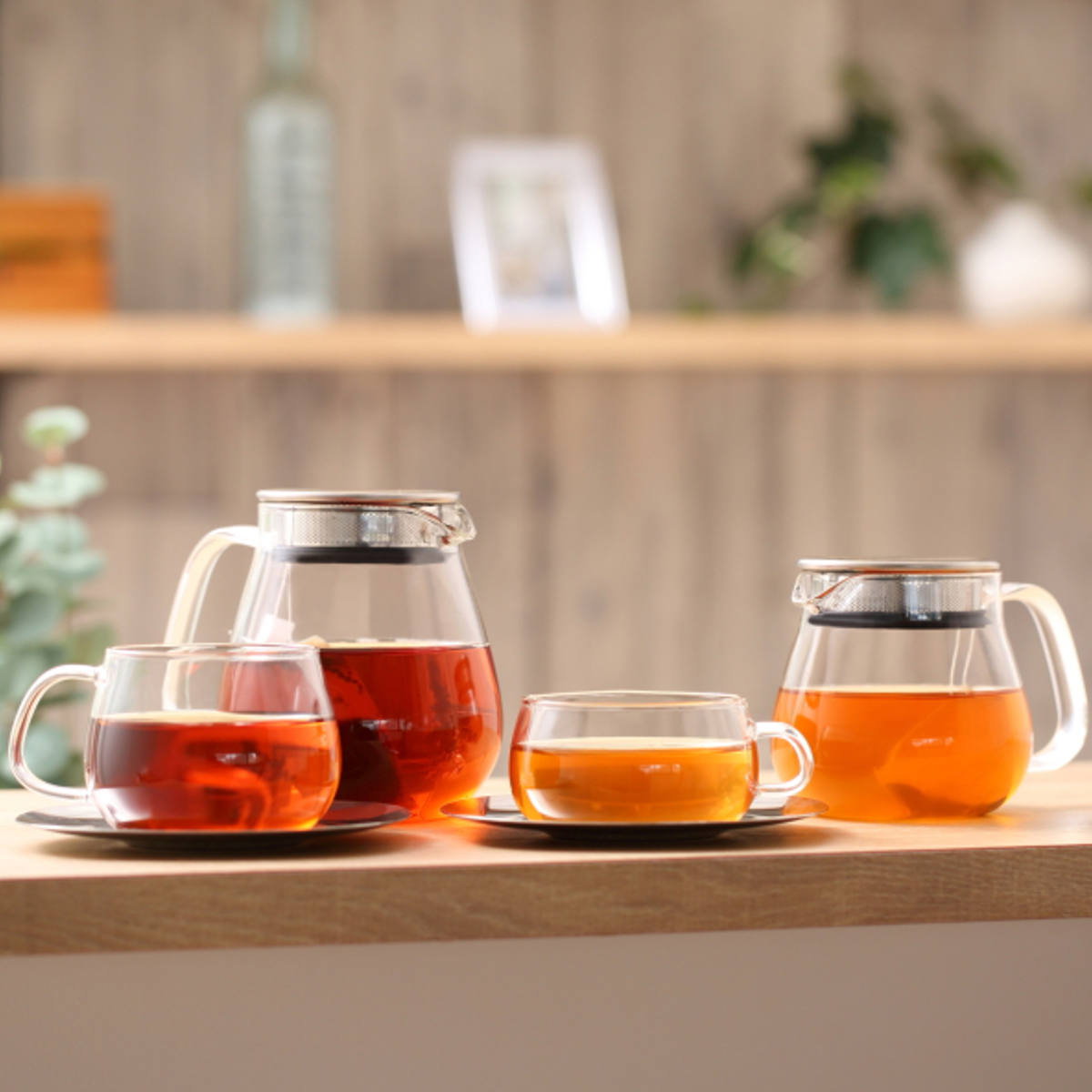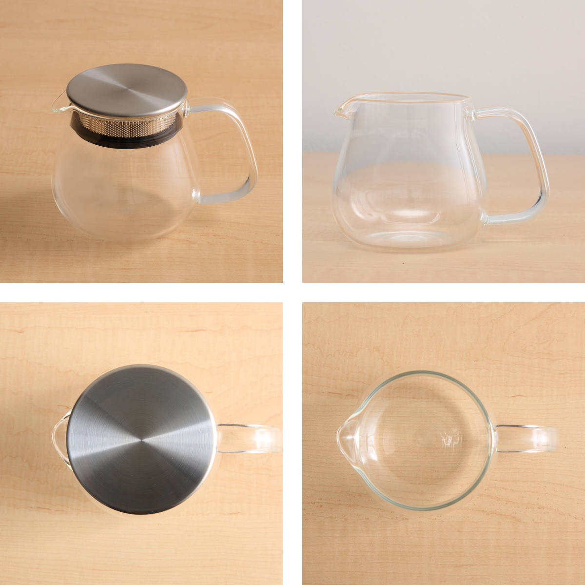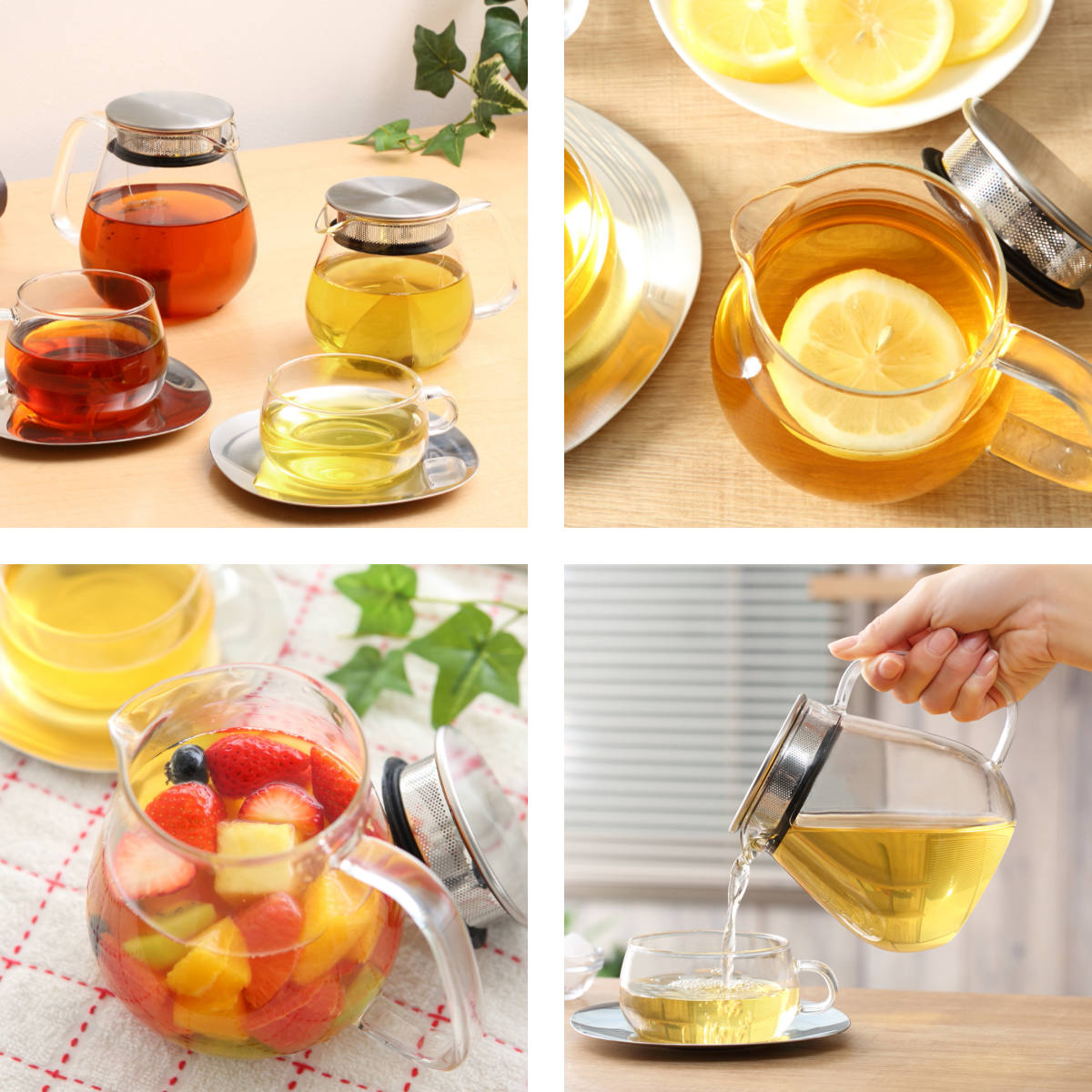 ポット本体がガラス製なので、茶葉が開く様子やドリンクの色をじっくりと眺めて愉しめます。紅茶やハーブティー、レモンティーや日本茶など、様々なドリンクに合わせやすいデザインです。