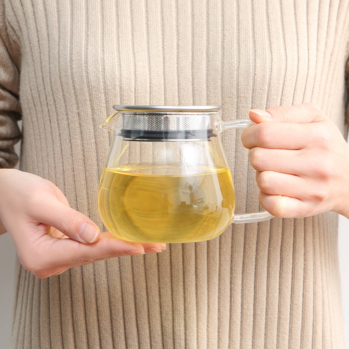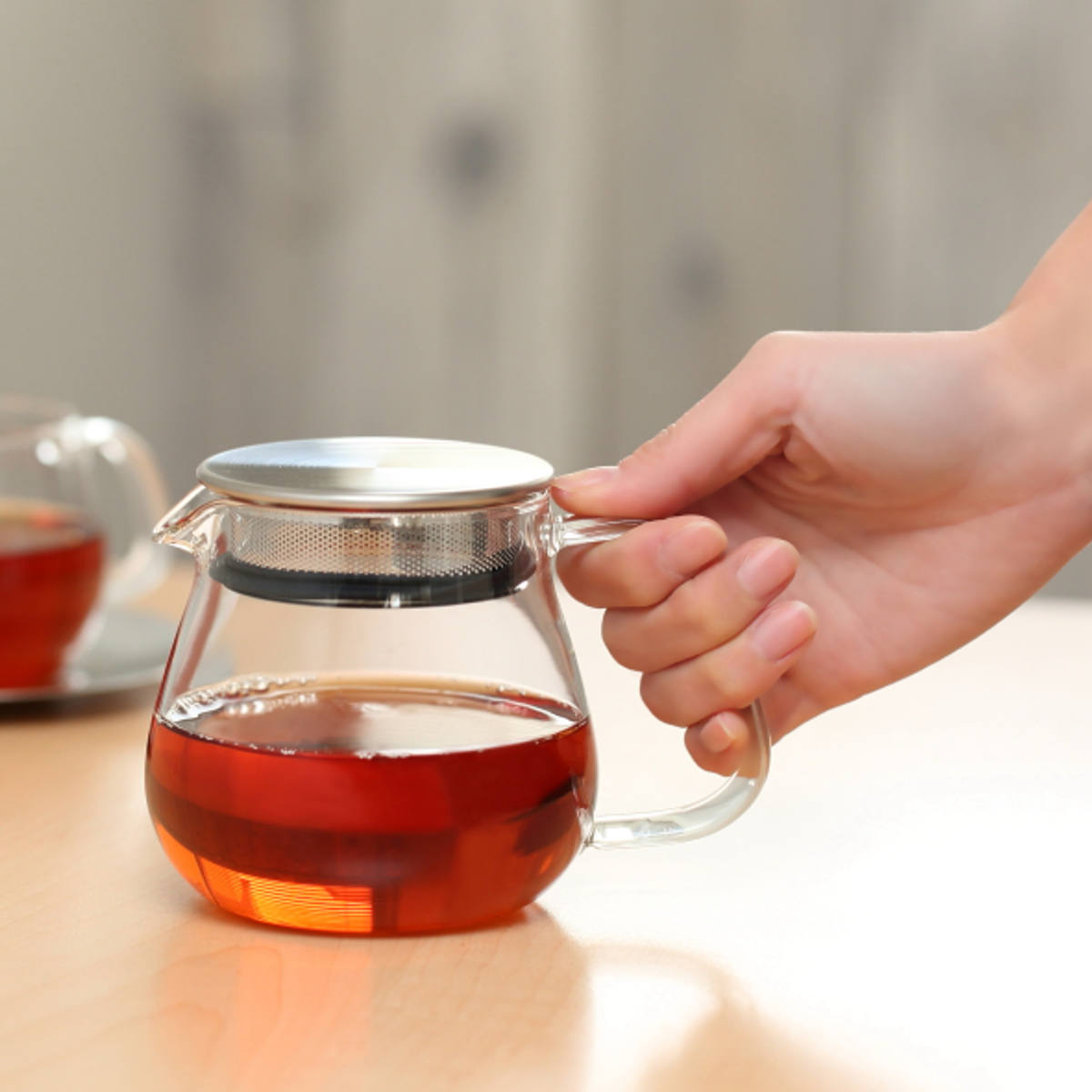 パーツが少なくお手入れが簡単で、毎日の生活の中でカジュアルに活躍するティーポットです。ゆったりとしたハンドルはしっかりと握ることができ、安定感のある使い心地です。約2杯分を入れるのにちょうどいいサイズ感です。