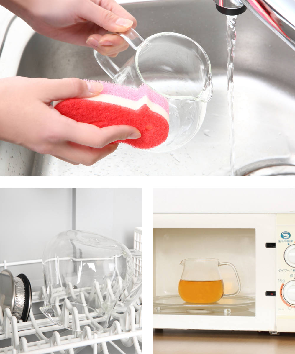 広口設計でジャグの底までスポンジが届き、隅々までしっかり洗えます。またパーツが少ないシンプル構造なのでお手入れが簡単です。食洗機・電子レンジにも対応しているので温め直しも楽々です。