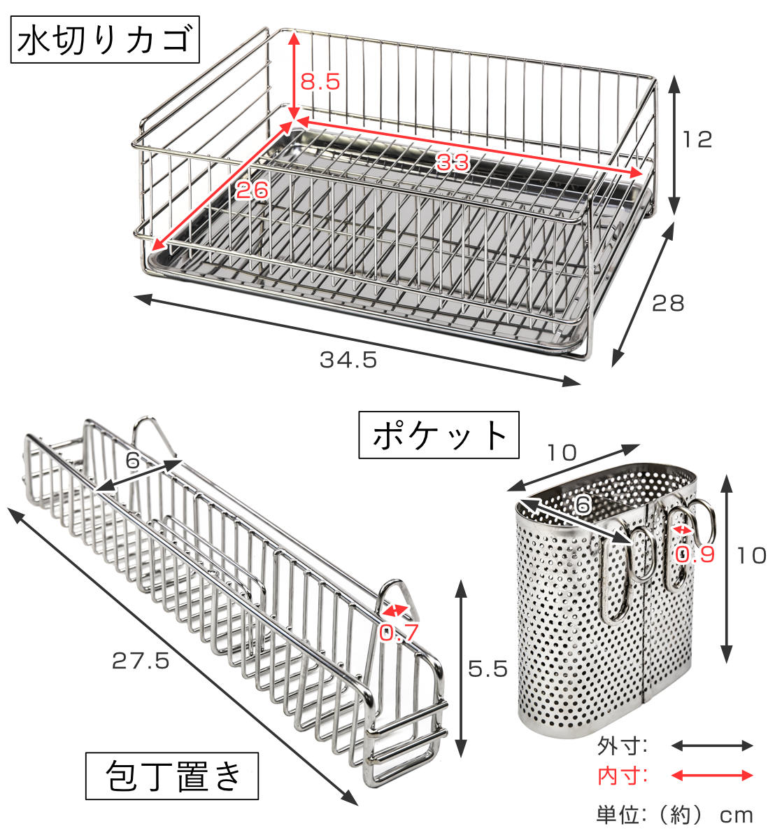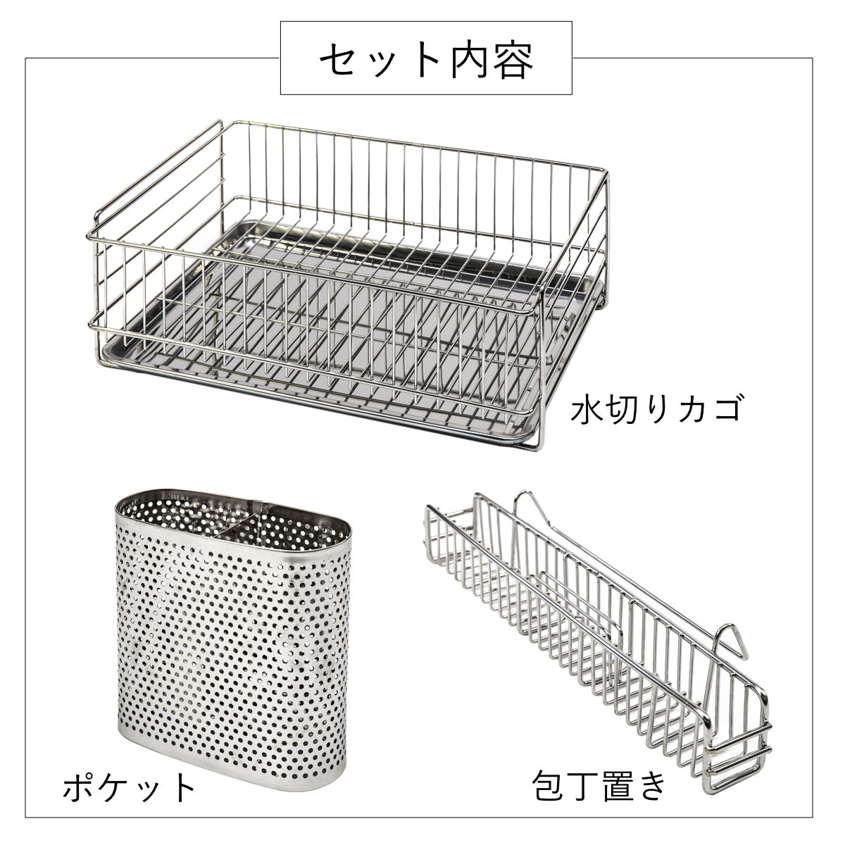 3点すべて錆びにくくて丈夫なステンレス製です。カゴや包丁置きは汚れのたまりやすいワイヤーの交差を減らした仕様になっており、洗いやすくいつでも清潔にお使いいただけます。