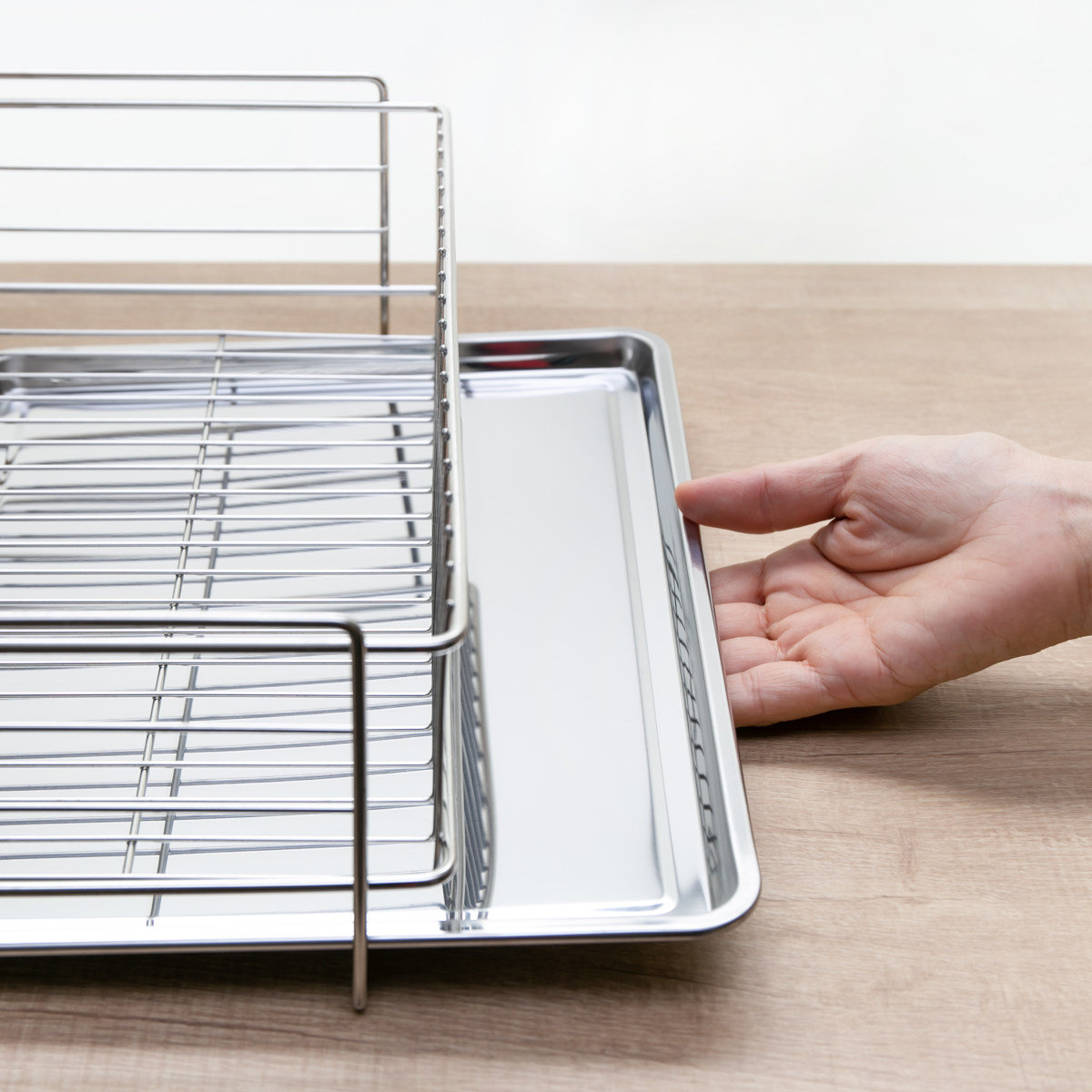 食器をおいたままでもトレーを引き出すことができ、水が溜まってしまった時お手入れが簡単です。ラックの奥にトレー用のストッパーが付いているので、トレーが奥から滑り落ちる心配もありません。