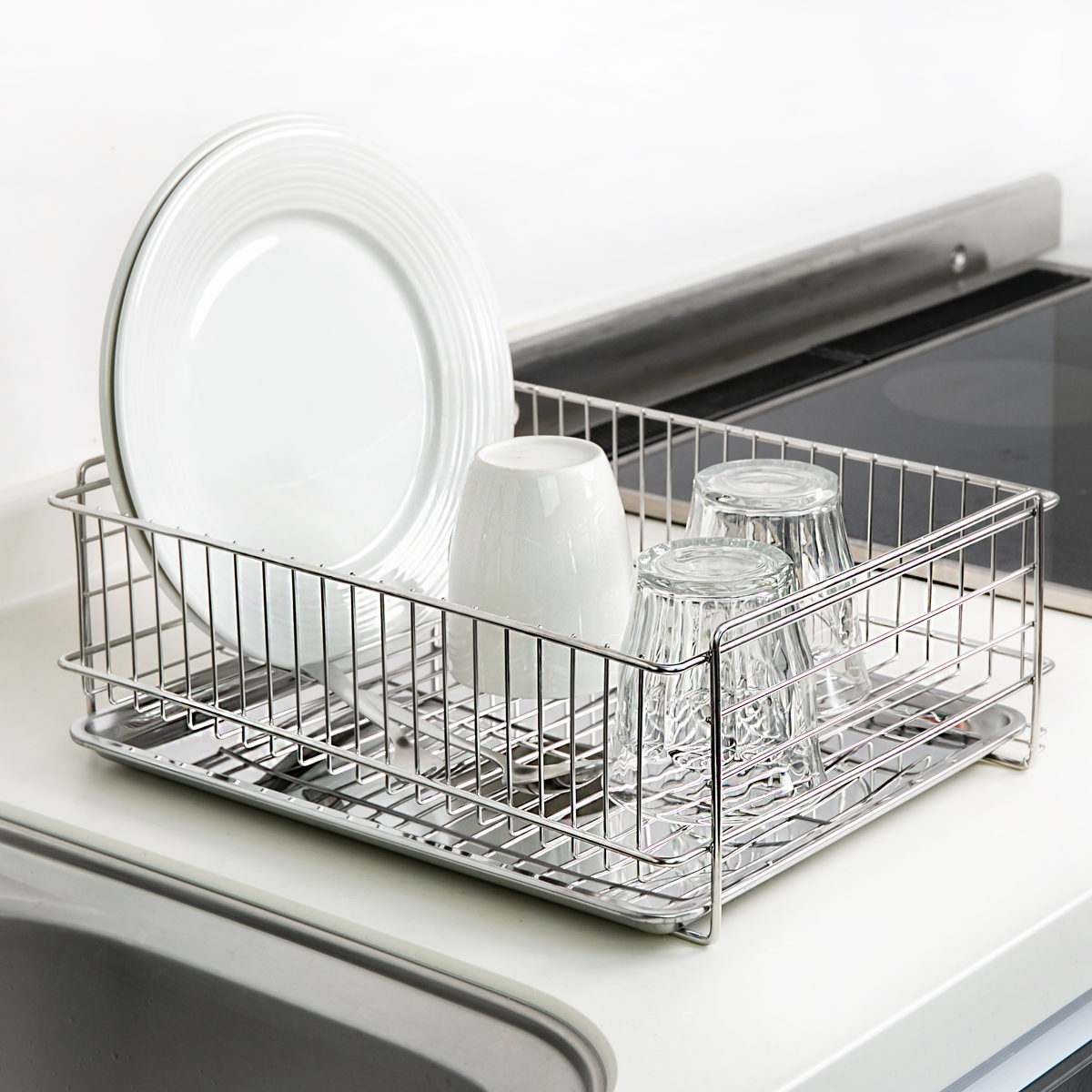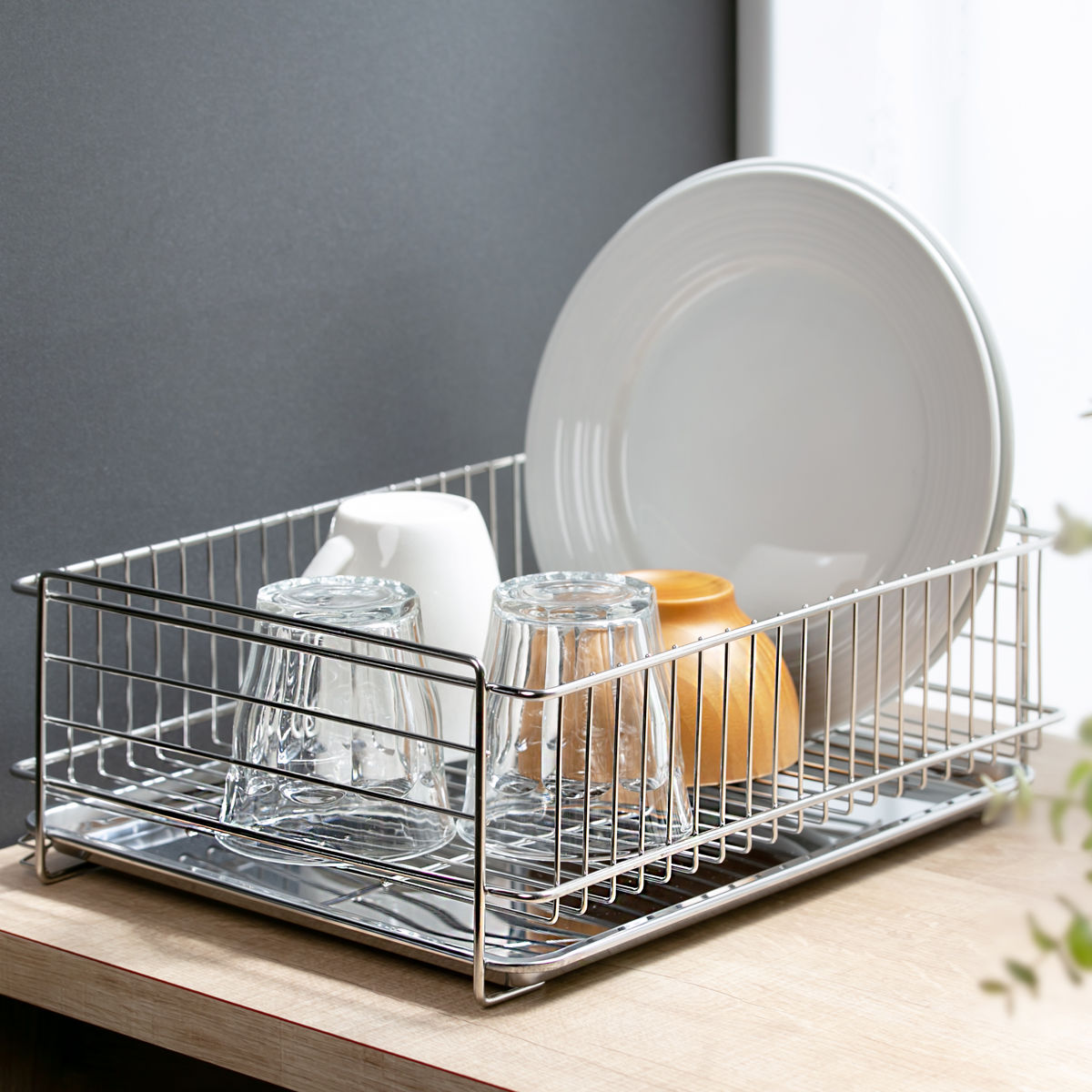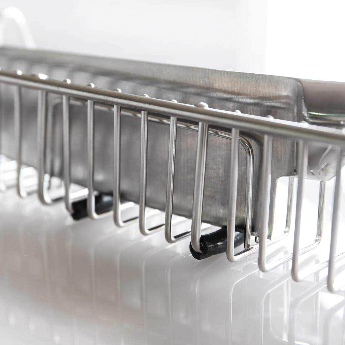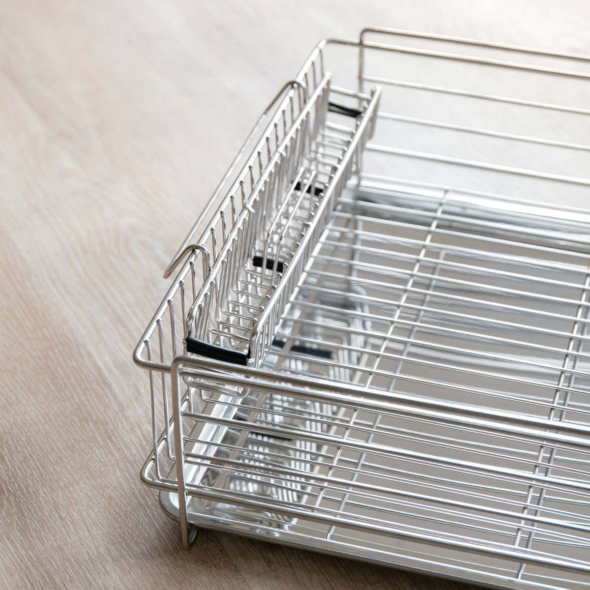 洗い物から落ちた水滴はカゴ下のトレーがしっかり受け止めます。シンクに隣接する場所で使用する必要がなく、好きな場所で使用することができます。